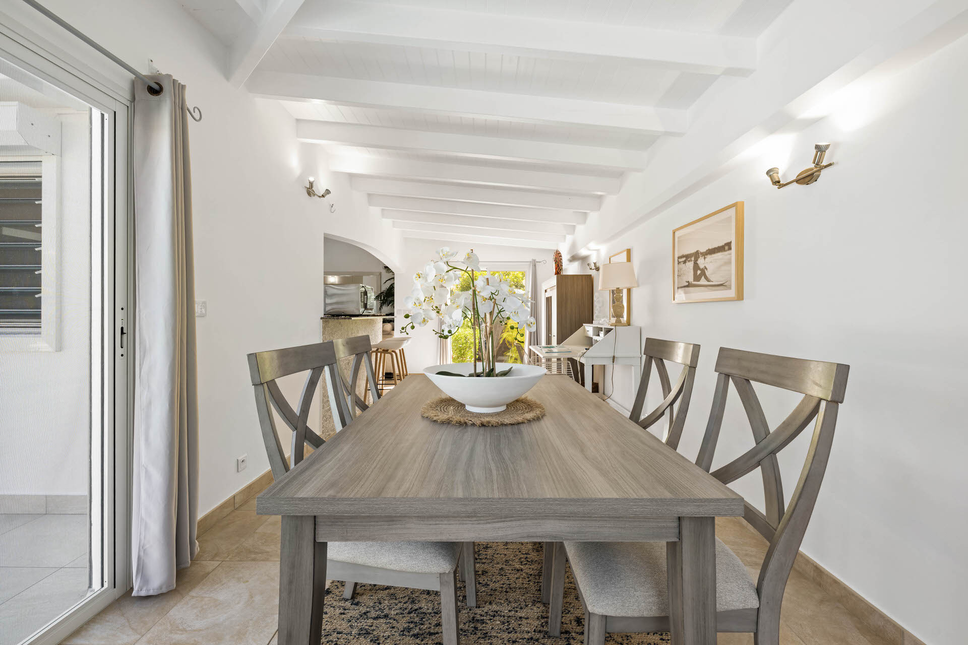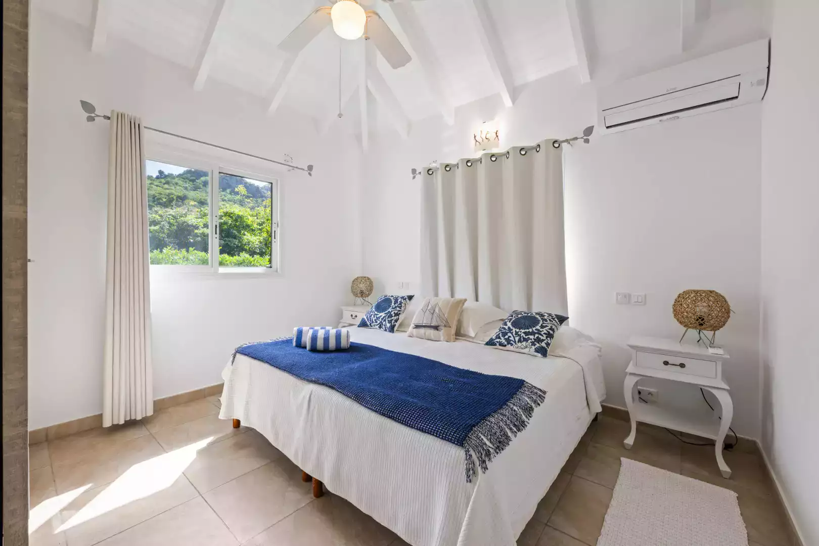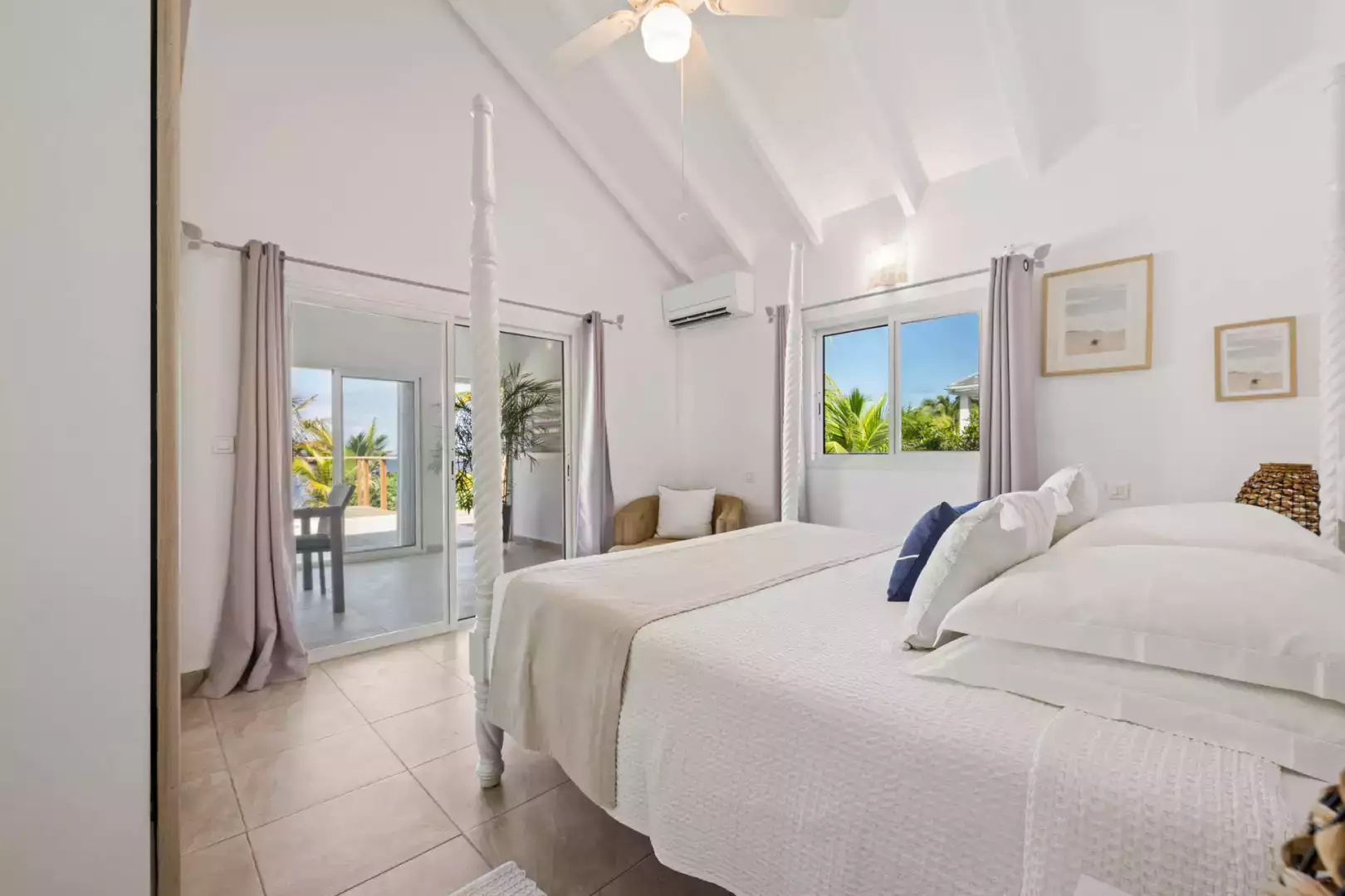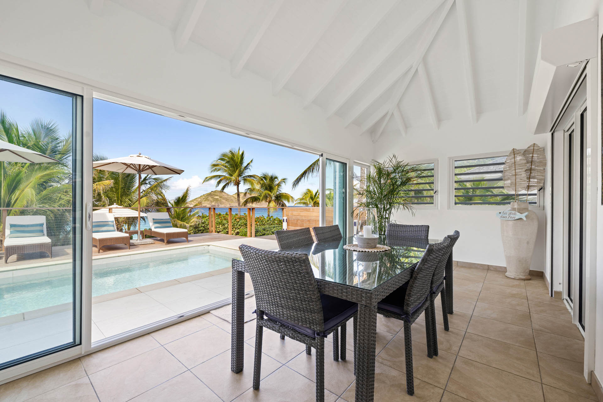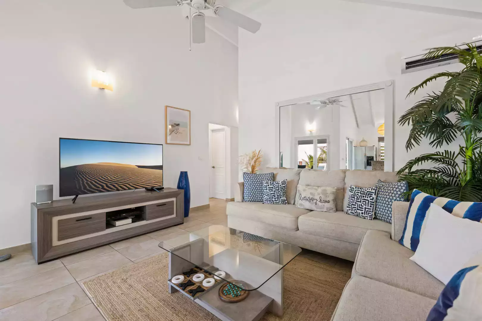 La villa comprend deux chambres climatisées, chacune avec ventilateur au plafond et lit king size (dont une transformable en lits jumeaux), partageant une salle de bain pratique. Le salon, lumineux et confortable, est équipé de la télévision satellite française et américaine. La salle à manger attenante, installée dans une pièce séparée pouvant s’ouvrir entièrement sur l’extérieur, permet de savourer les repas tout en profitant de l’air marin.