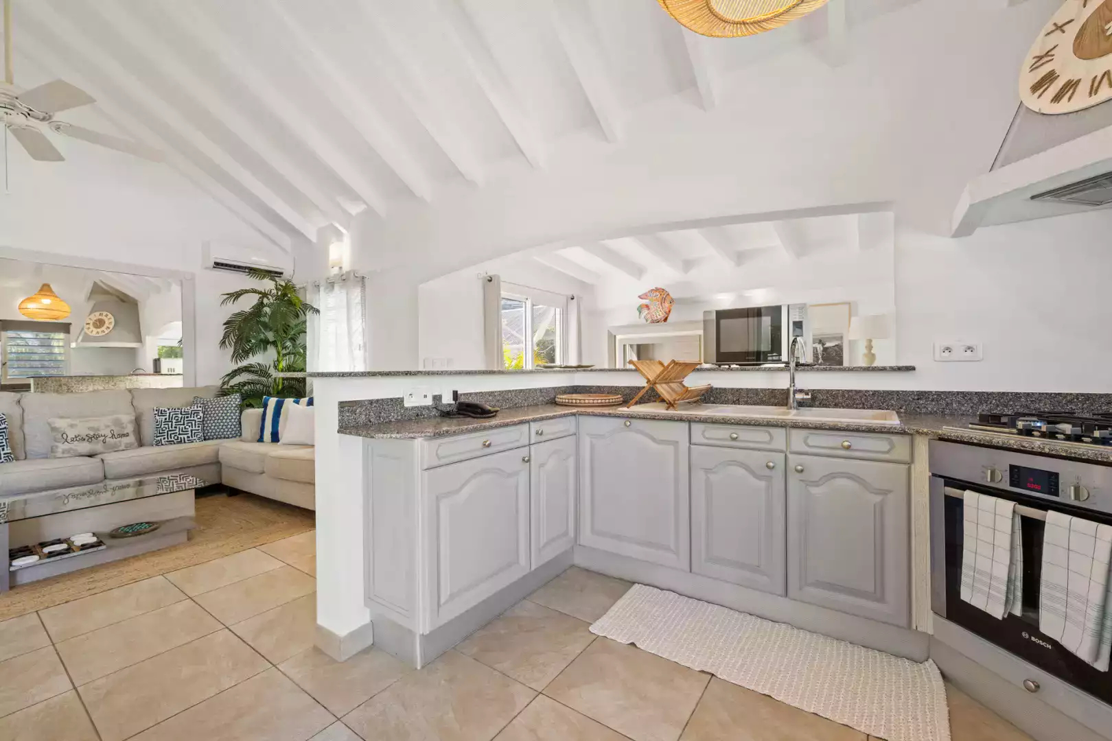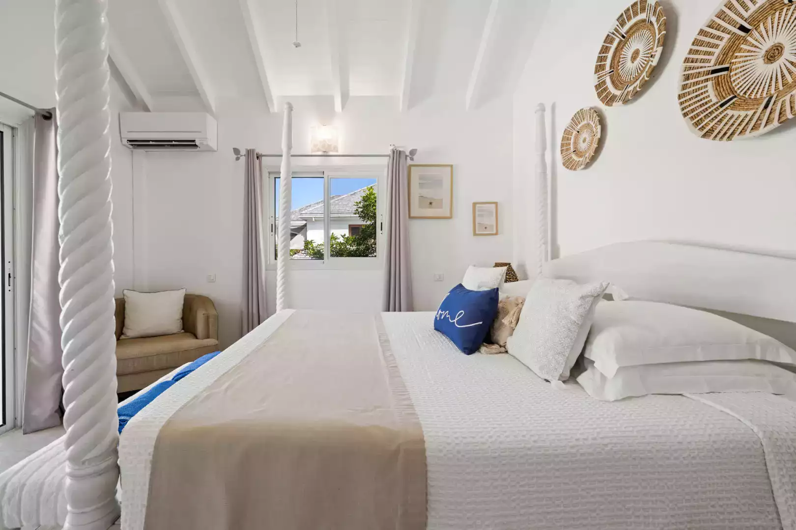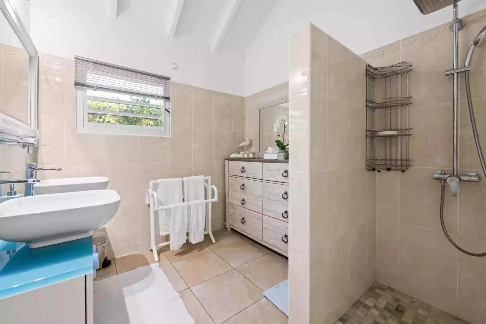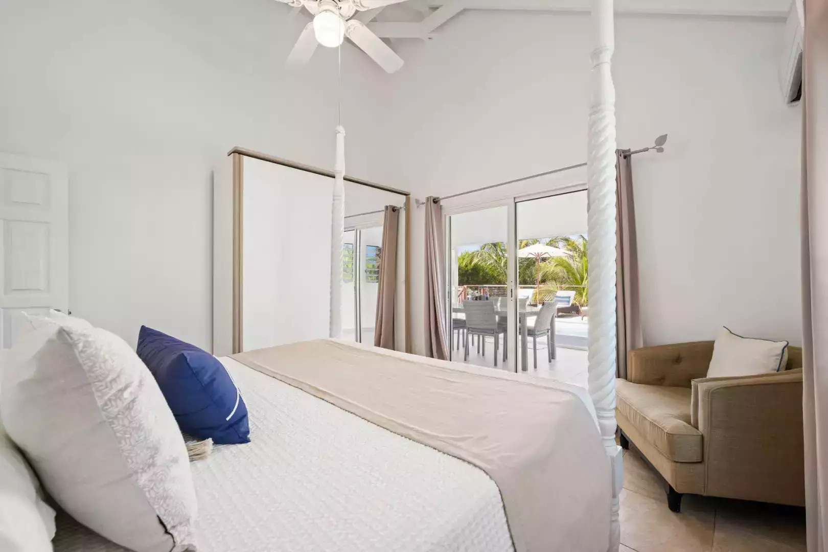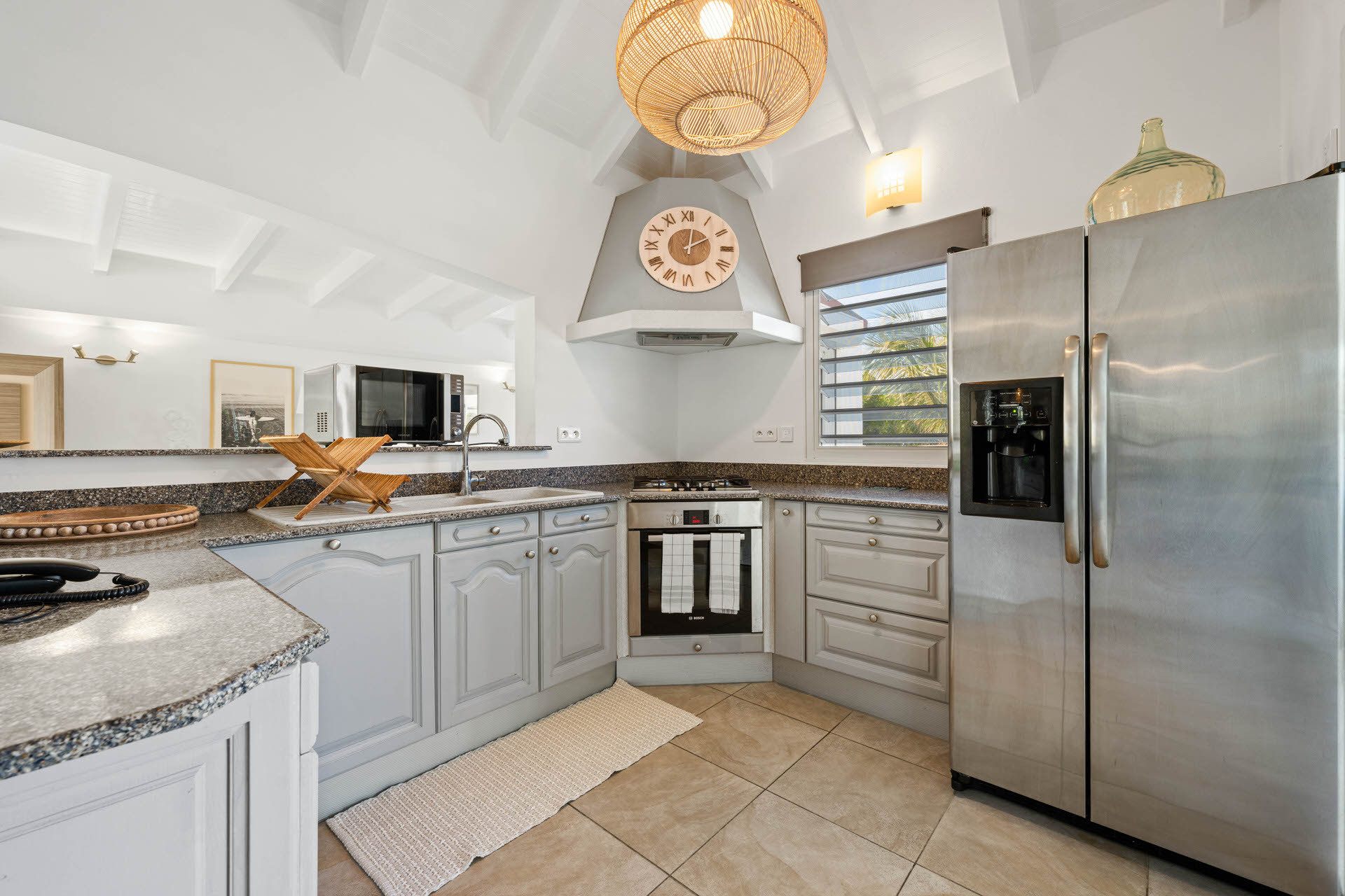 La villa comprend deux chambres climatisées, chacune avec ventilateur au plafond et lit king size (dont une transformable en lits jumeaux), partageant une salle de bain pratique. Le salon, lumineux et confortable, est équipé de la télévision satellite française et américaine. La salle à manger attenante, installée dans une pièce séparée pouvant s’ouvrir entièrement sur l’extérieur, permet de savourer les repas tout en profitant de l’air marin.