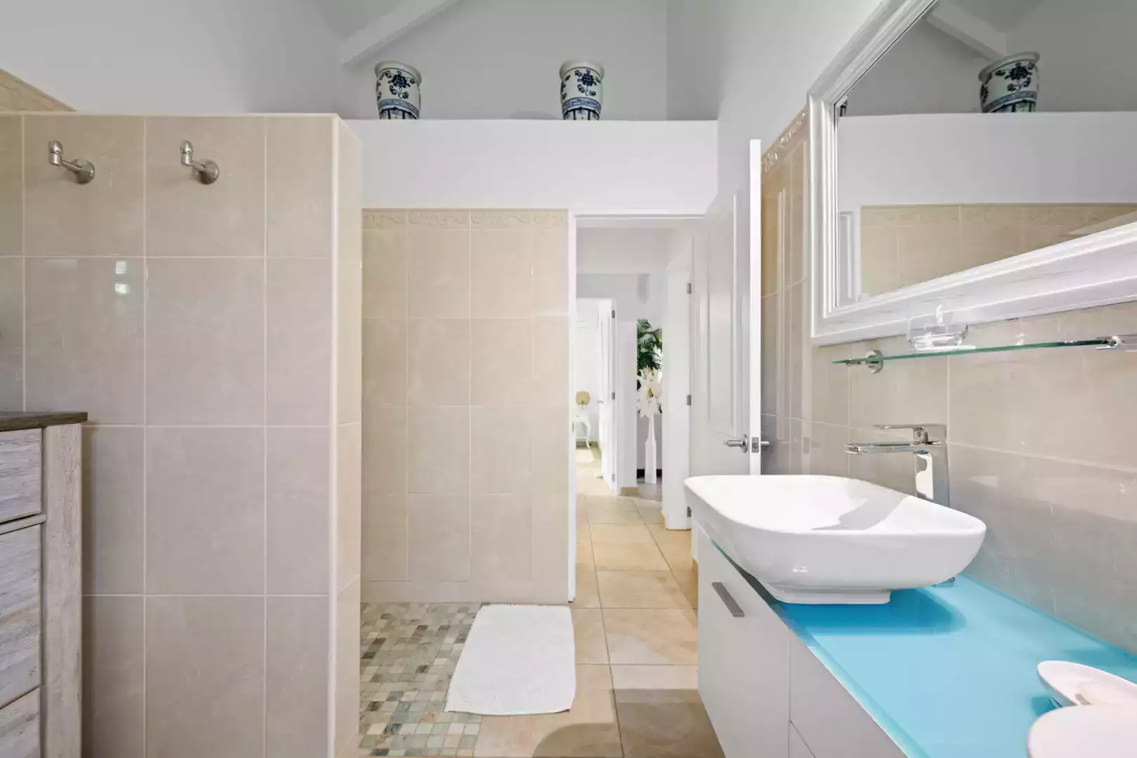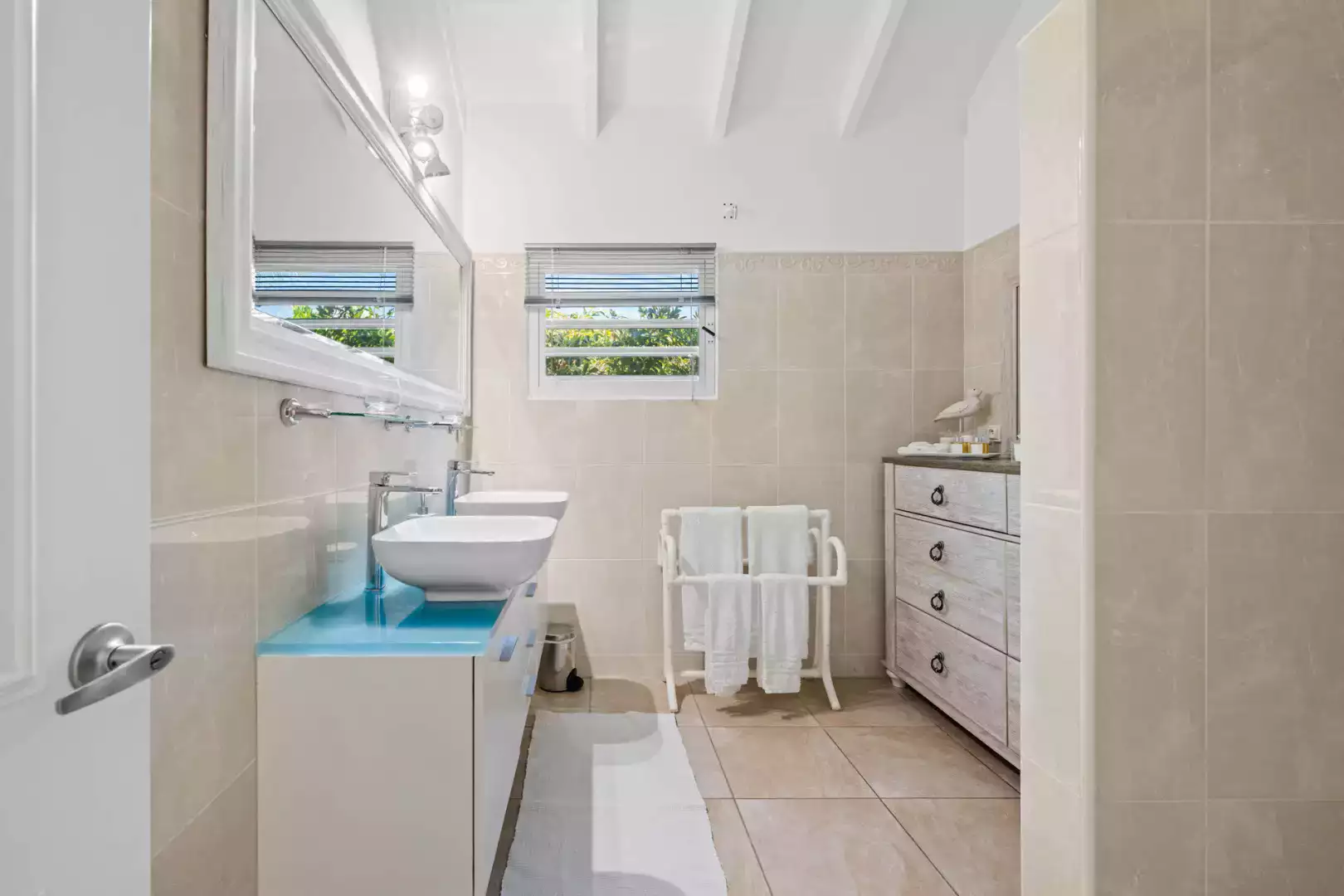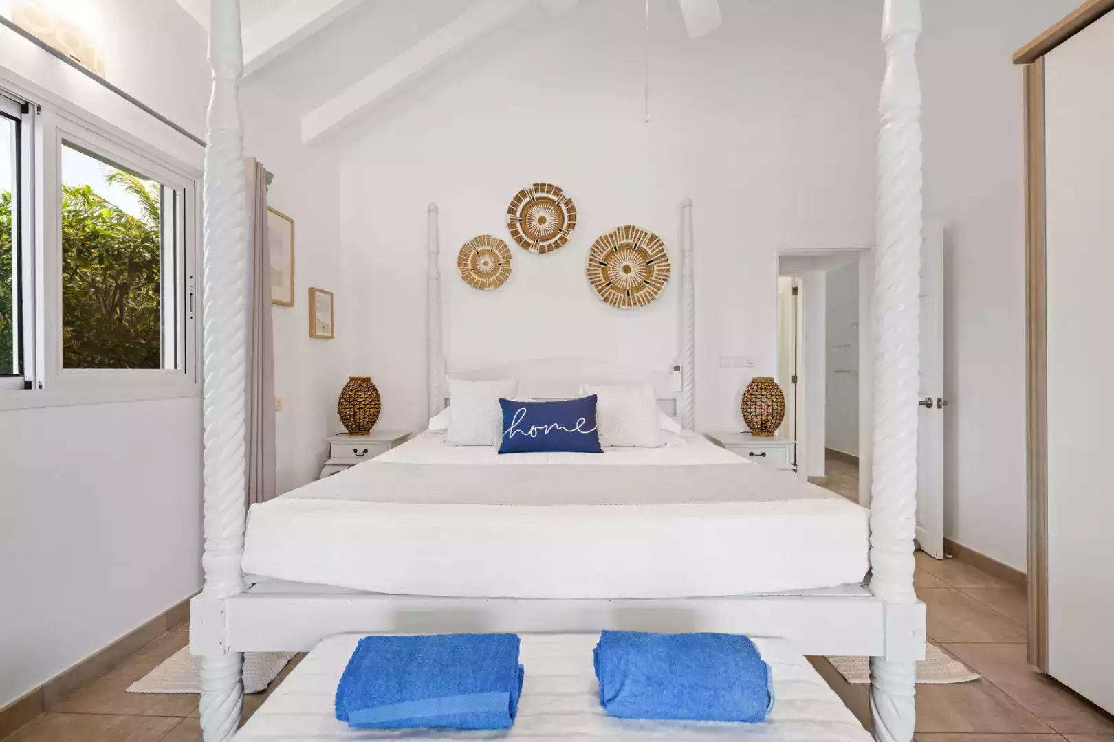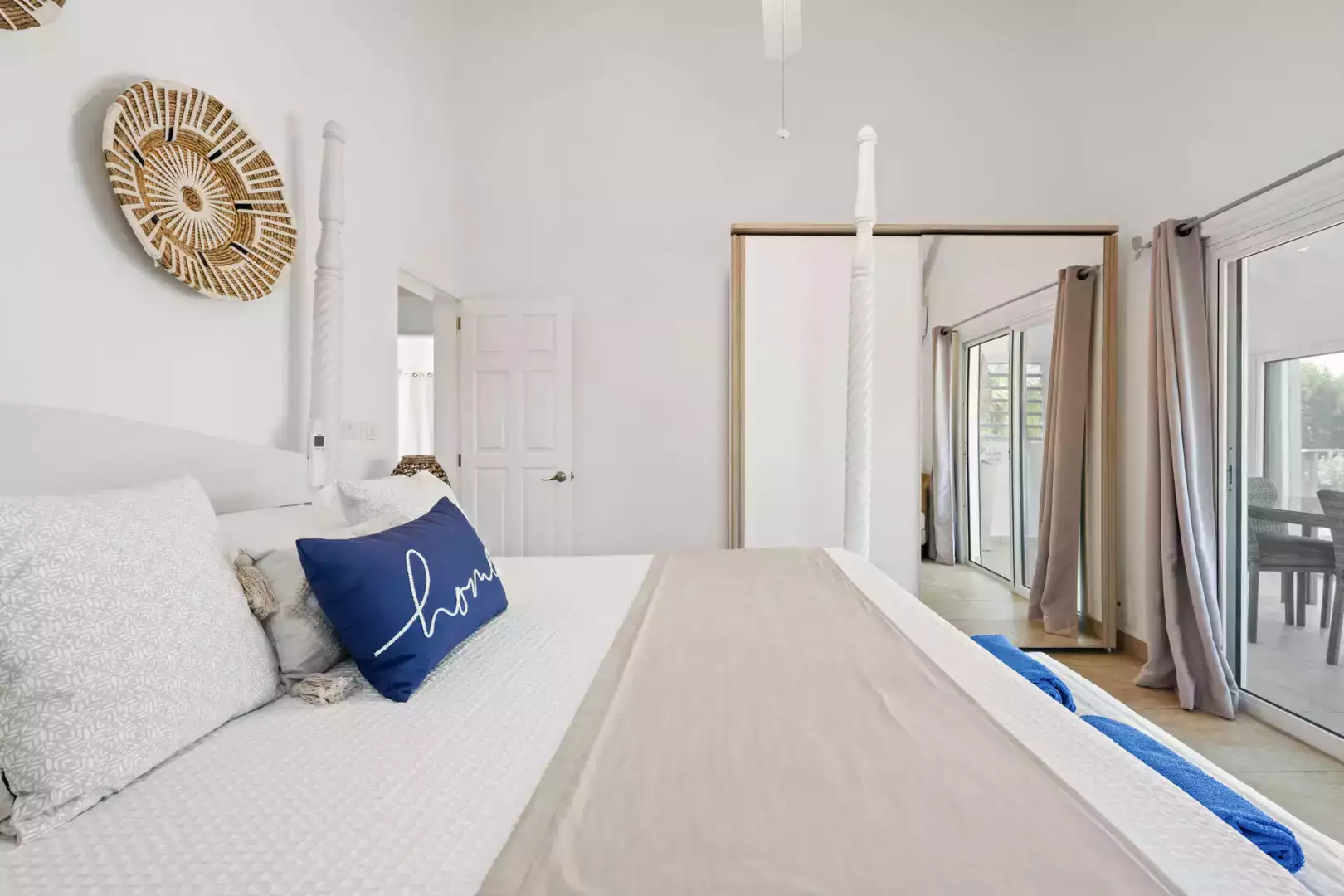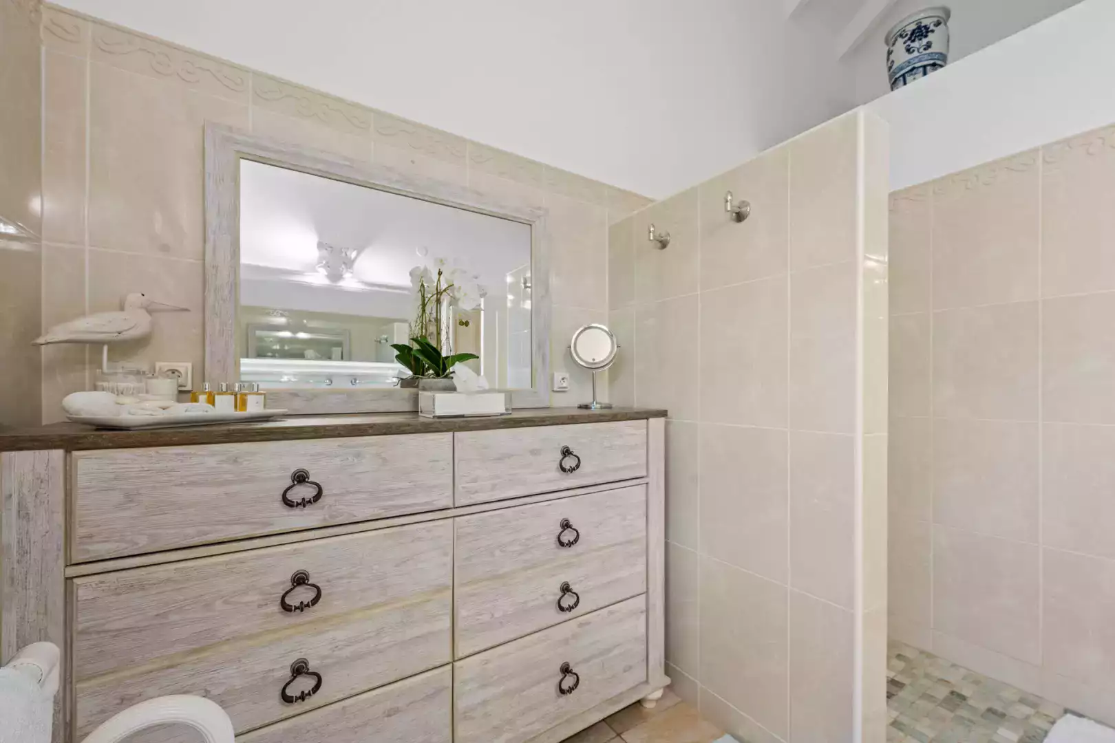 La villa comprend deux chambres climatisées, chacune avec ventilateur au plafond et lit king size (dont une transformable en lits jumeaux), partageant une salle de bain pratique. Le salon, lumineux et confortable, est équipé de la télévision satellite française et américaine. La salle à manger attenante, installée dans une pièce séparée pouvant s’ouvrir entièrement sur l’extérieur, permet de savourer les repas tout en profitant de l’air marin.