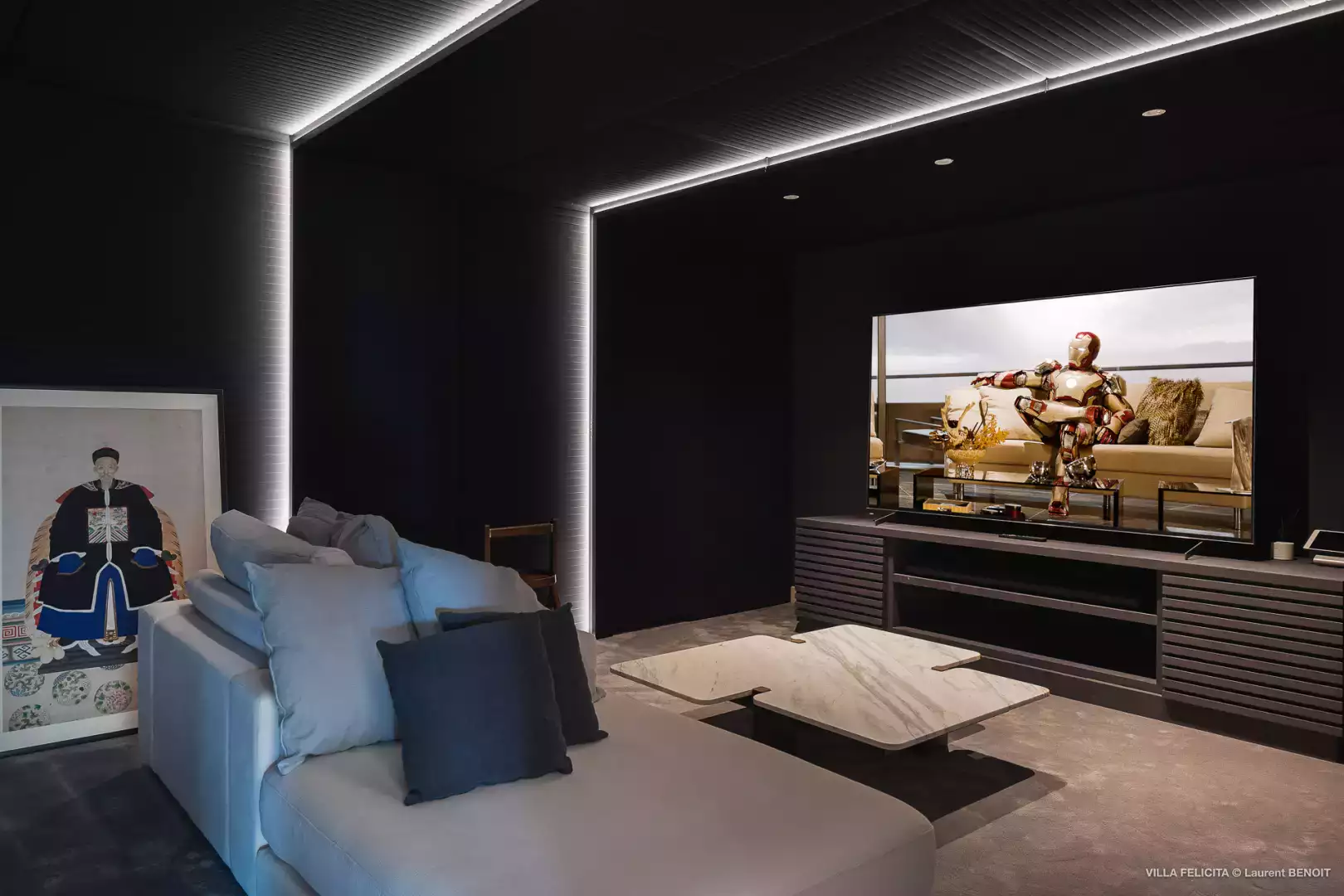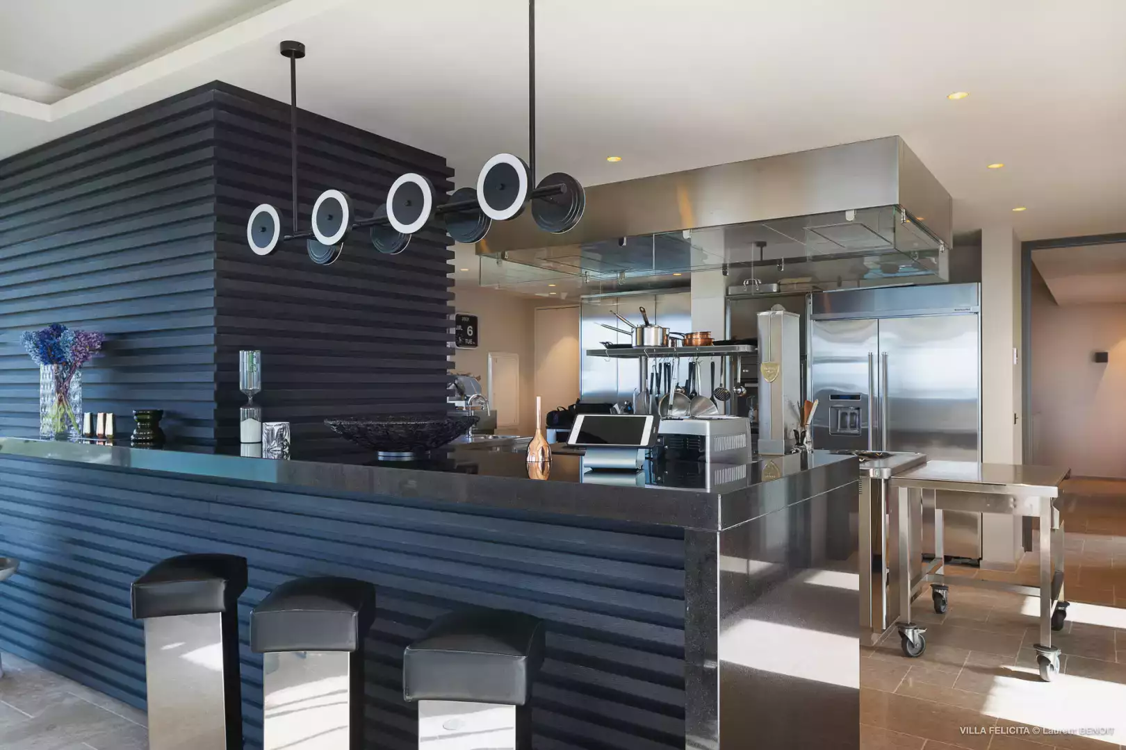 Une cuisine professionnelle entièrement équipée, une salle de sport avec vue mer, une salle de cinéma ainsi que des espaces de loisirs (ping-pong, babyfoot) viennent compléter les prestations haut de gamme de cette villa spectaculaire.