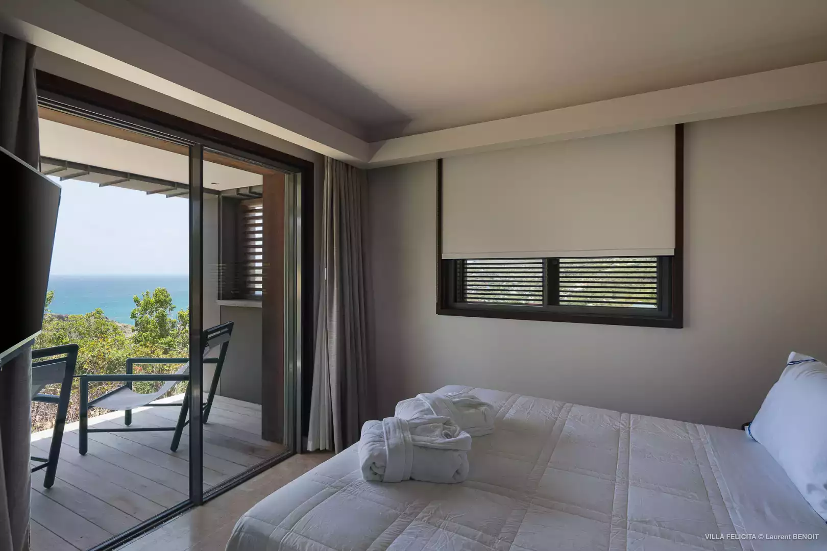 Lit King size (180 cm), vue mer, climatisation (A/C), HDTV, dressing, salle de bain adjacente avec douche et toilettes, sèche-cheveux, coffre-fort, terrasse privée.
