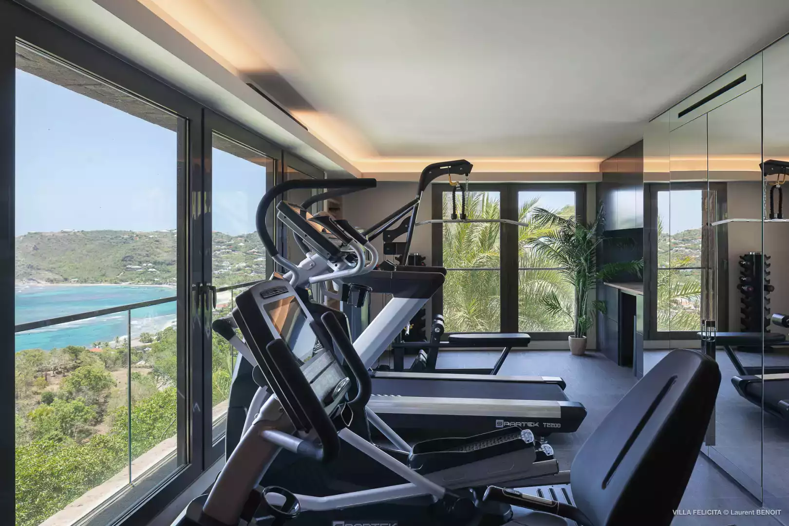 Située à un niveau inférieur, climatisation (A/C), vue mer, tapis de course, vélo elliptique, haltères.