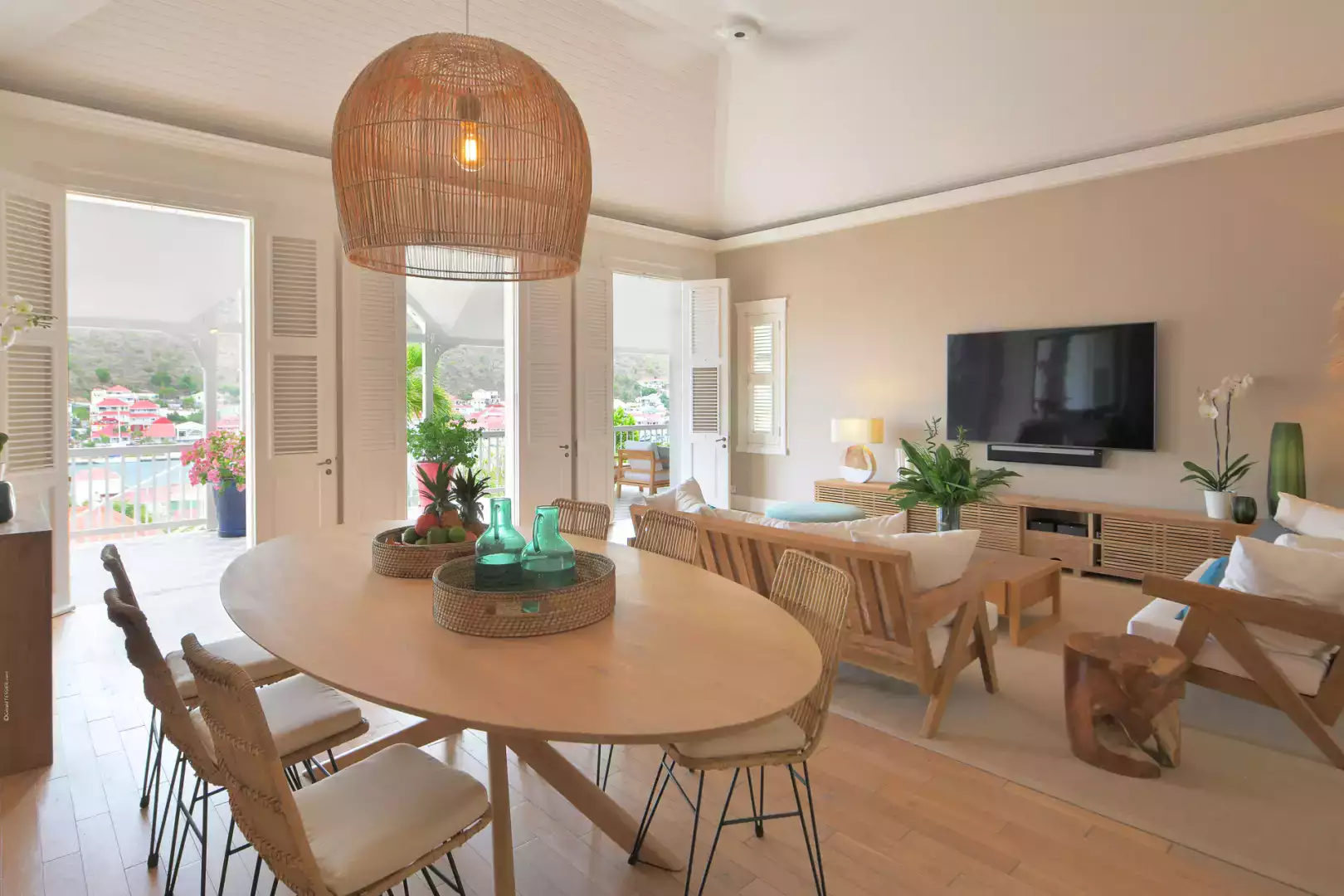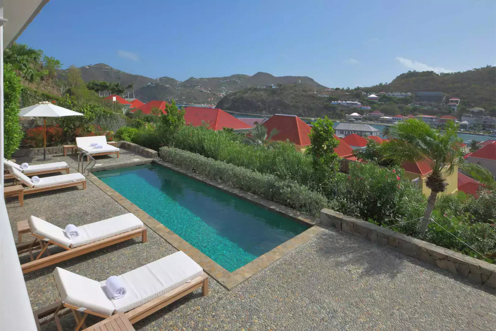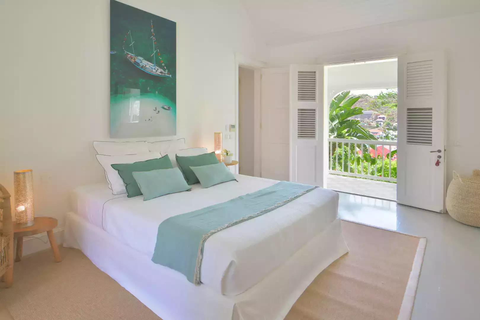À l’extérieur, la piscine chauffée entourée de verdure invite à la détente. La villa bénéficie également d’une localisation idéale : à deux pas des restaurants, boutiques, et du port de Gustavia, tout en offrant une intimité totale. Un endroit parfait pour vivre l’ambiance de St Barth tout en profitant d’un cocon élégant et serein.
