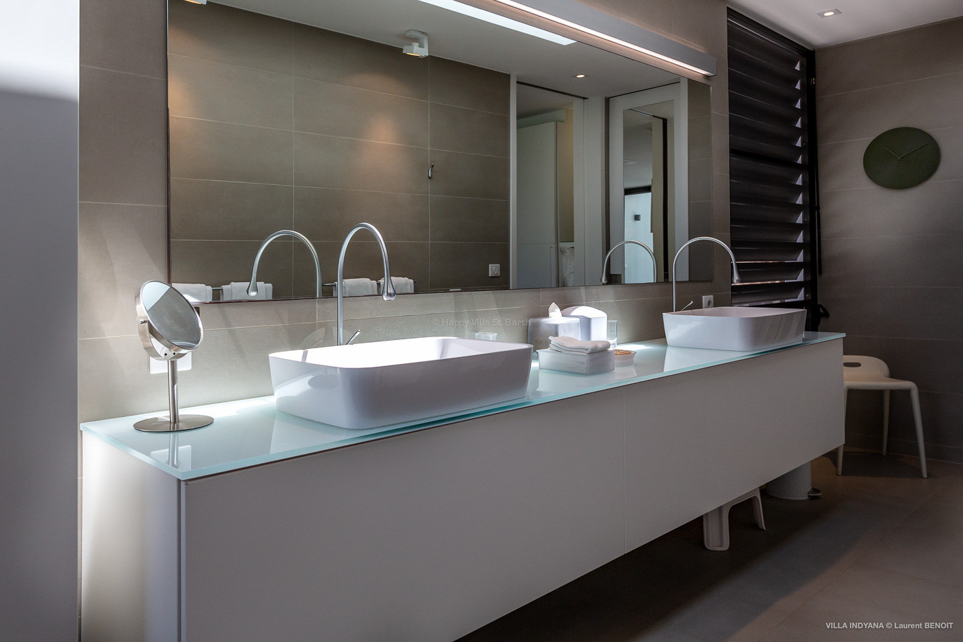 Mêmes équipements dans les deux villas : TV (satellite français et US), A/C, téléphone, système hifi intérieur / extérieur, toilettes invités.