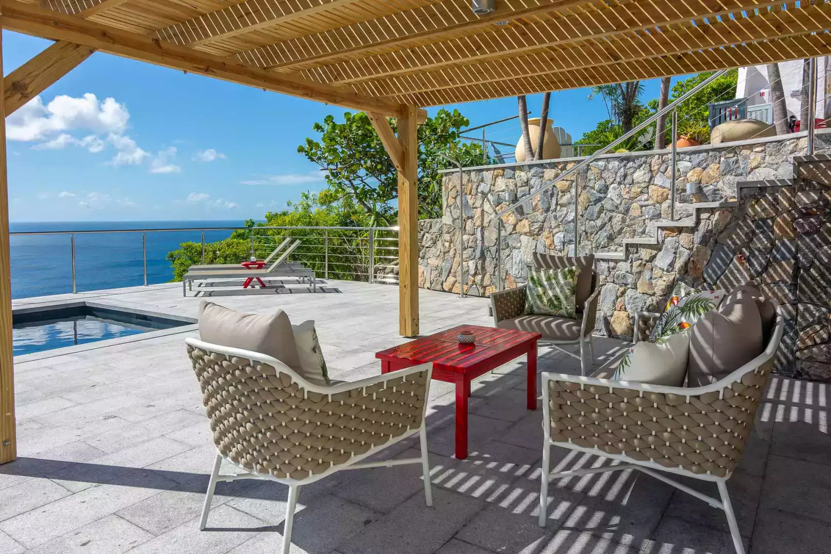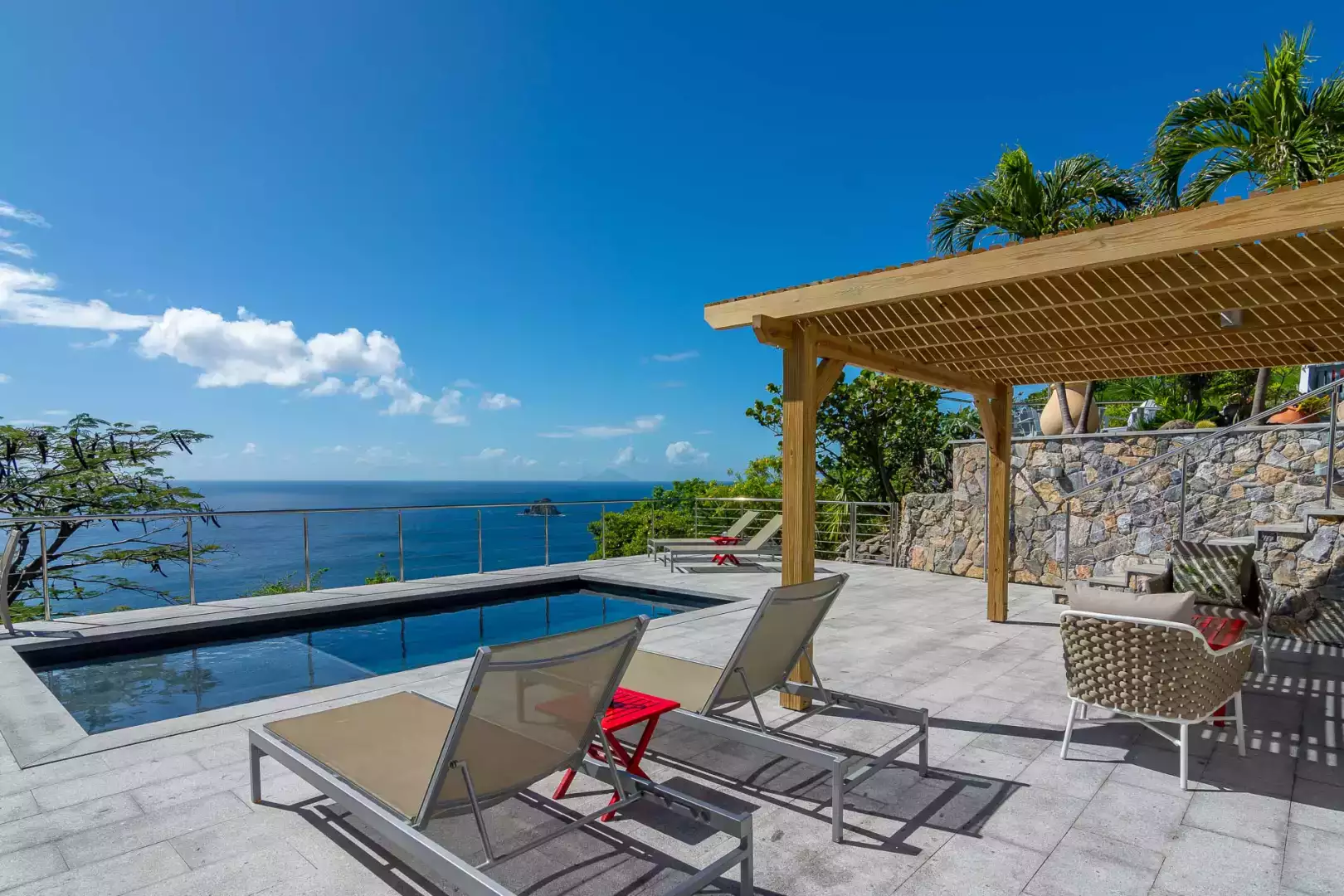 À l’extérieur, la grande terrasse en pierre naturelle surplombe la mer. Vous y trouverez une piscine à débordement, des transats, un coin lounge à l’ombre de la pergola et un espace repas en plein air. L’ensemble est bordé de plantes tropicales, dans une ambiance douce et authentique.