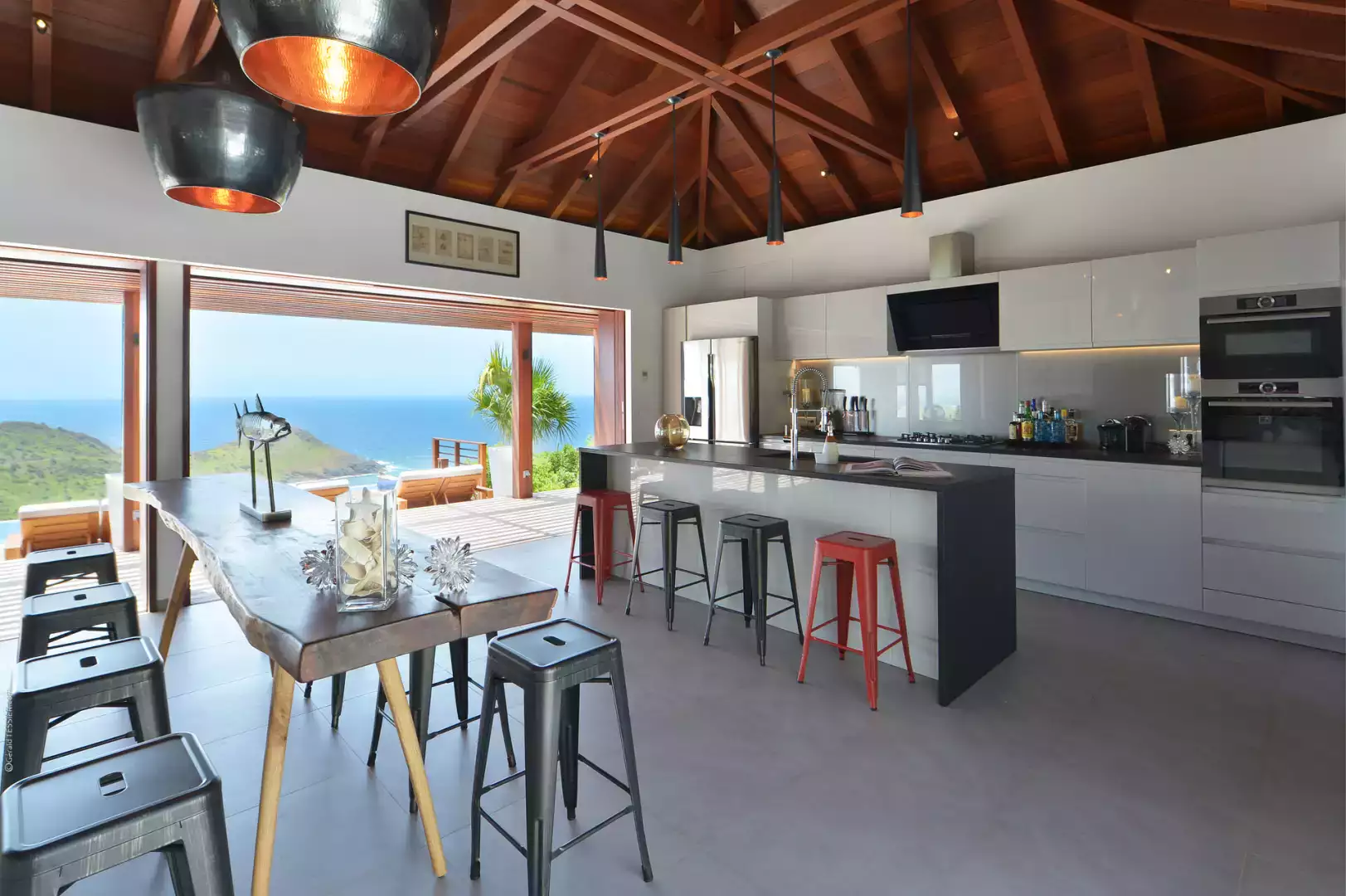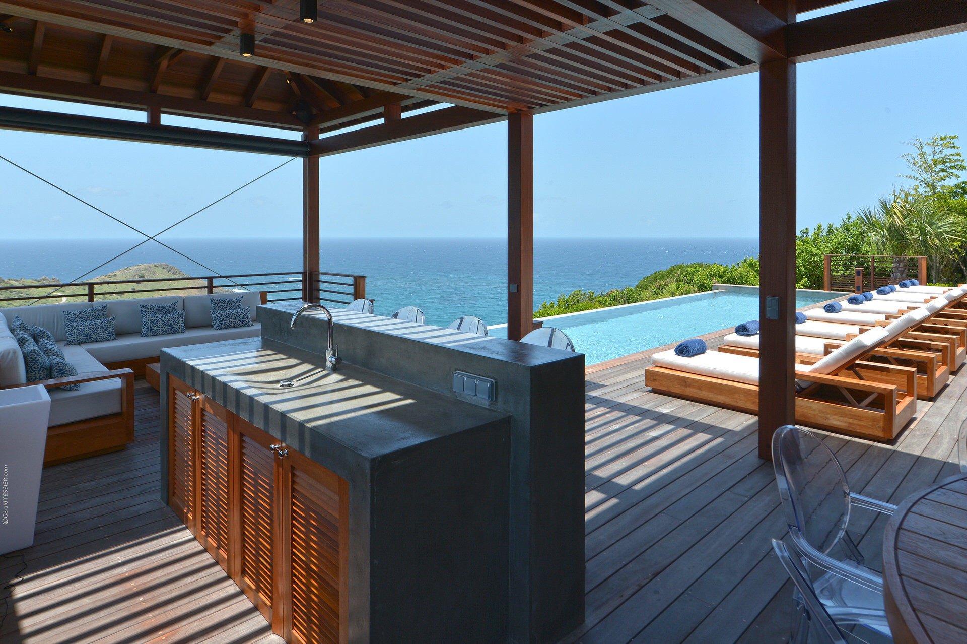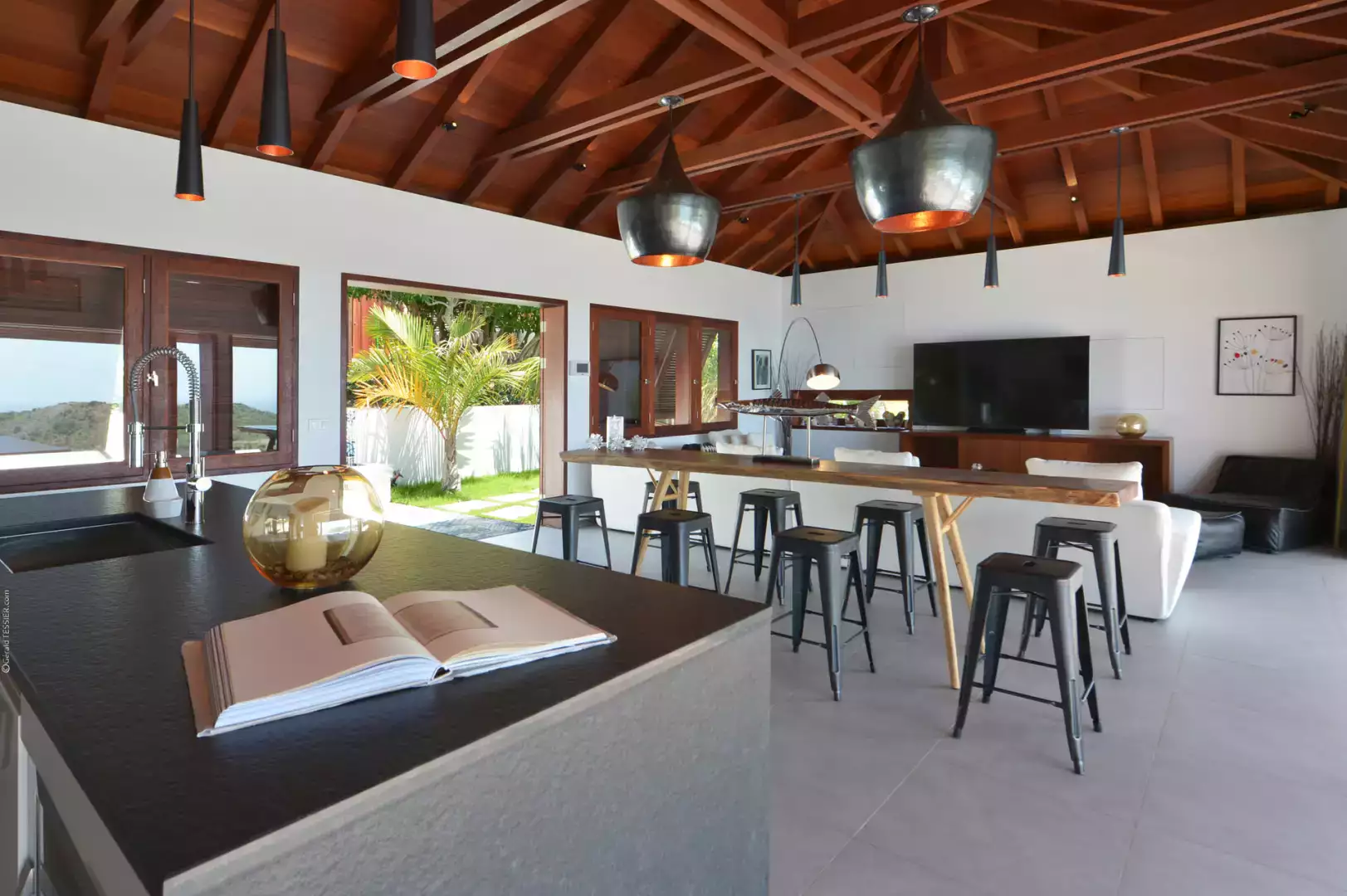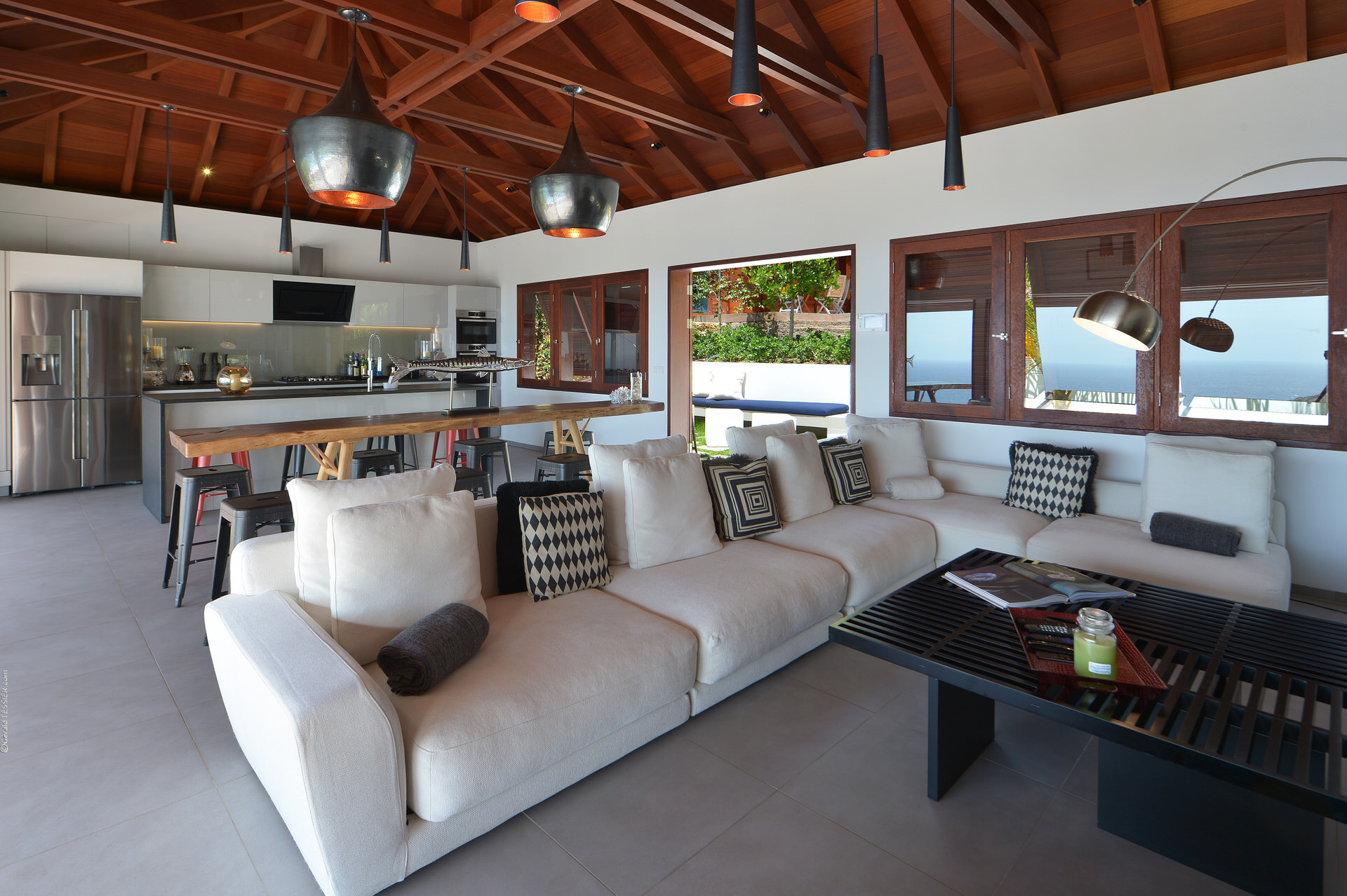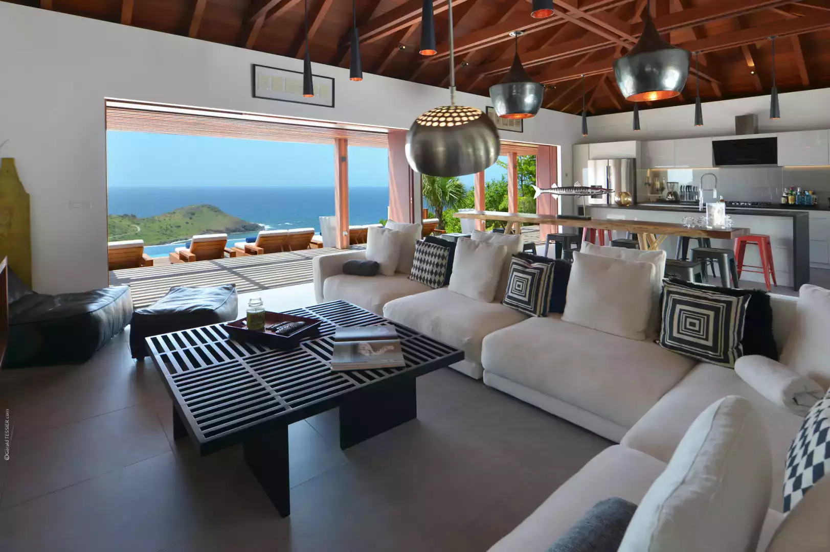 Située sur les hauteurs de Dévet, la Villa La Danse du Soleil offre une vue spectaculaire sur l’océan et sur la baie de Toiny. Son architecture mêle élégance contemporaine et charme caribéen, avec de beaux volumes, des poutres apparentes et une atmosphère chaleureuse. Le vaste séjour s’ouvre sur la terrasse et la piscine à débordement, idéale pour admirer les couchers de soleil ou se détendre face à la mer.