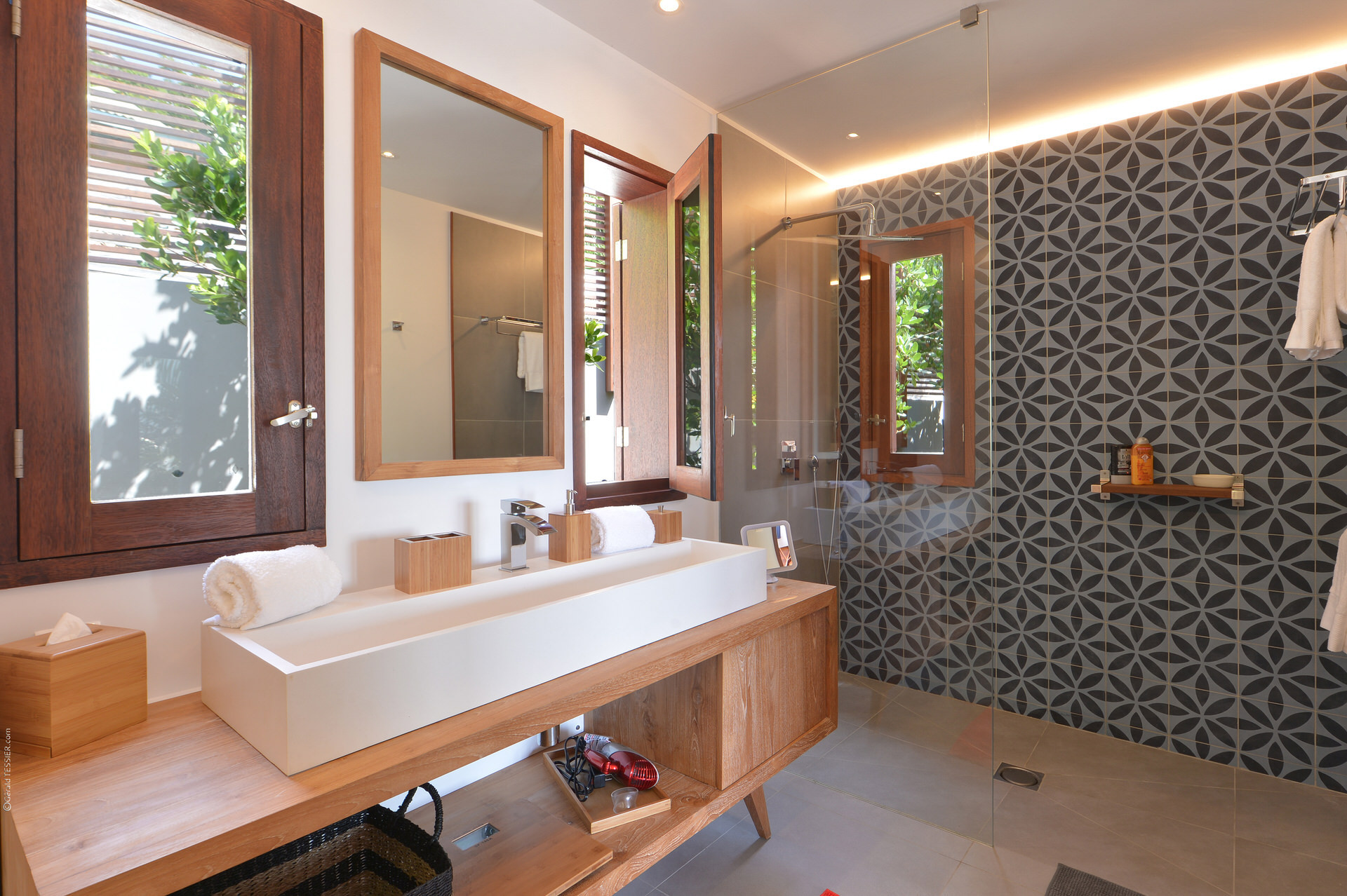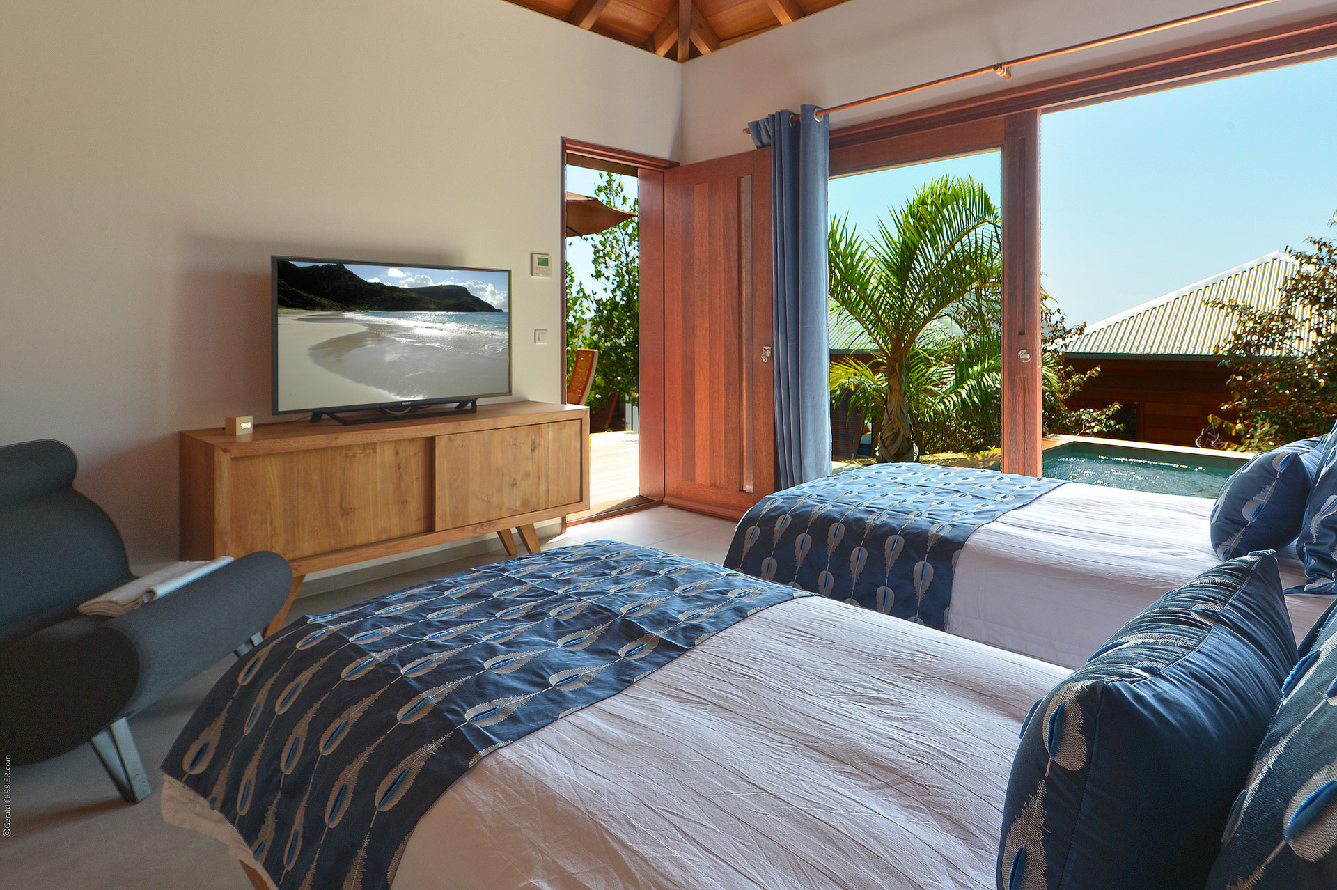 Lit King size (180 cm), climatisation (A/C), HDTV, coffre-fort, sèche-cheveux, salle de bain attenante avec douche et toilettes, possibilité de séparer les lits en deux lits simples, petite piscine privée partagée avec la chambre 4.