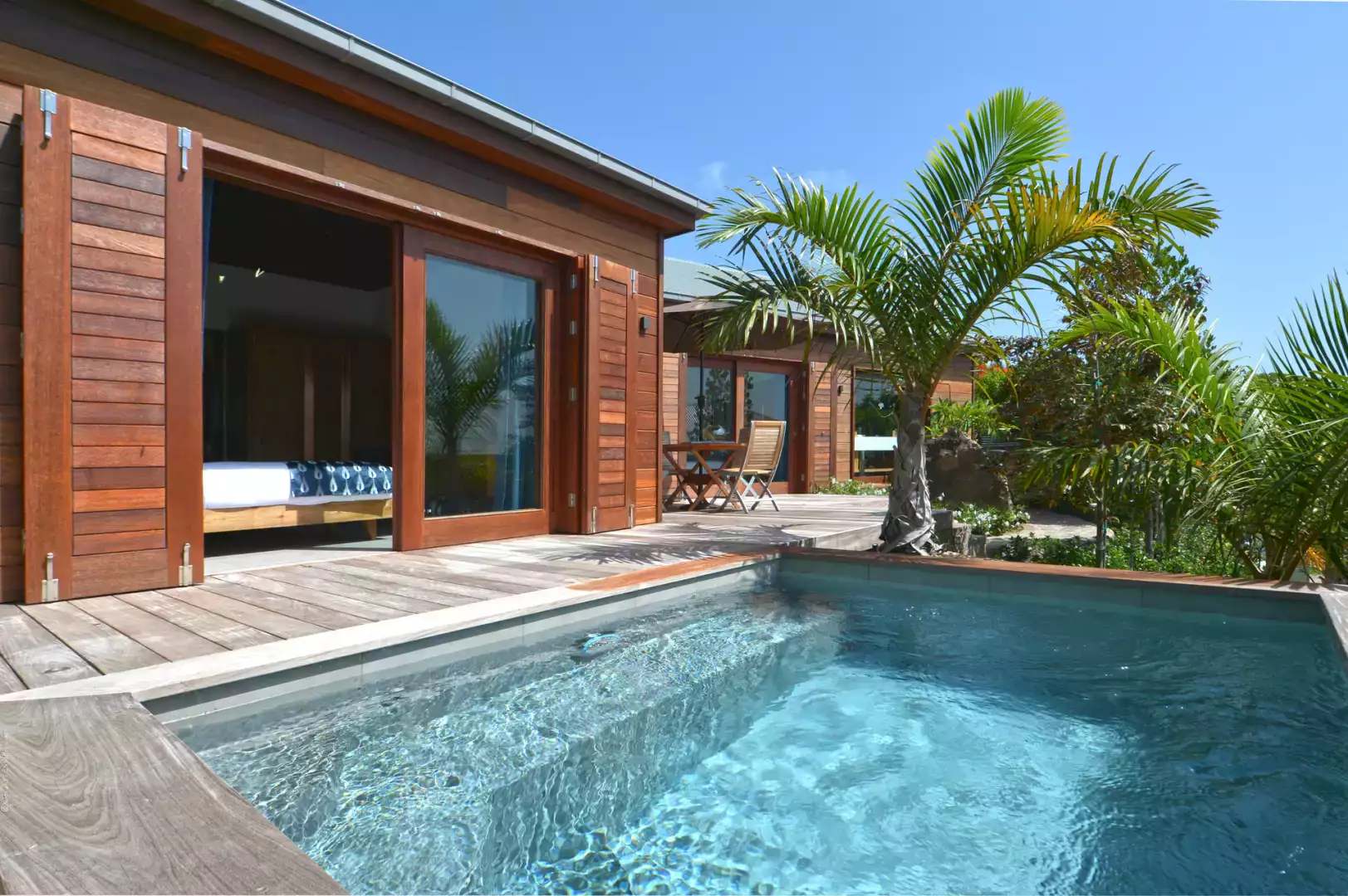 Lit King size (180 cm), climatisation (A/C), HDTV, coffre-fort, sèche-cheveux, salle de bain attenante avec douche et toilettes, petit bungalow à l’entrée, partage une petite piscine avec la chambre 3.