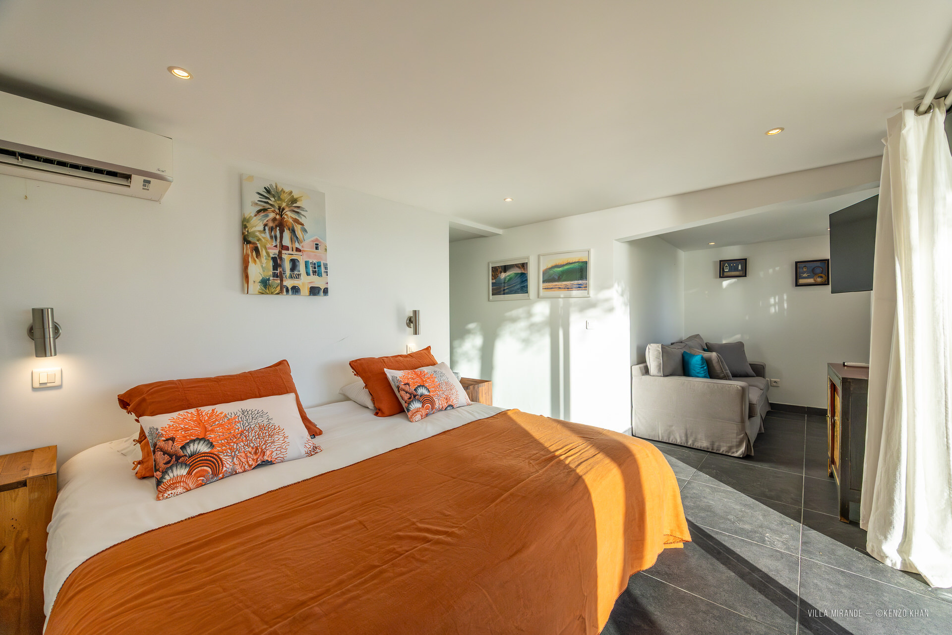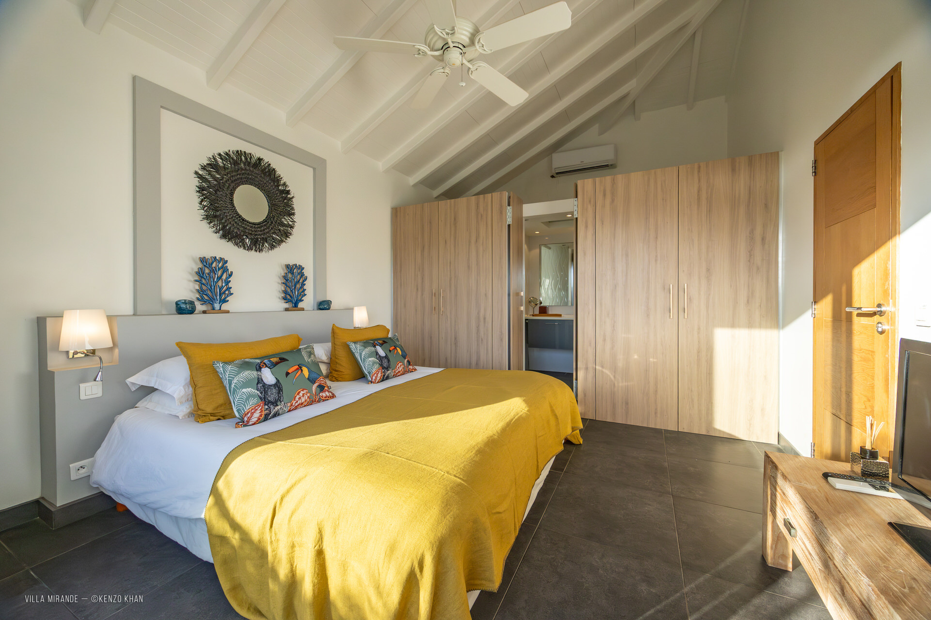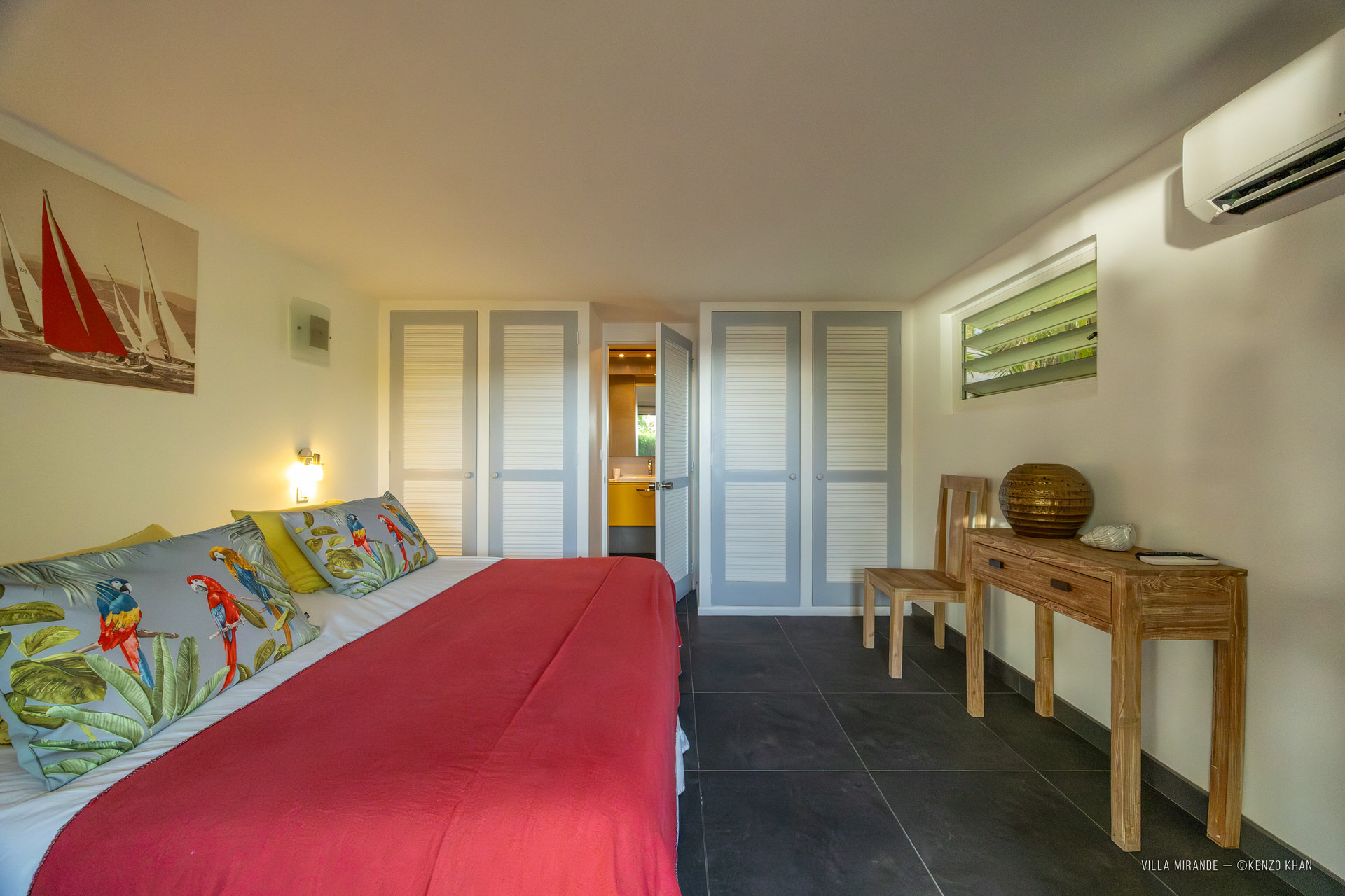 Au niveau supérieur, Lit King size (180 cm), climatisation (A/C), vue mer, salle de bain adjacente avec douche et toilettes, moustiquaires aux baies, sèche-cheveux, coffre-fort
