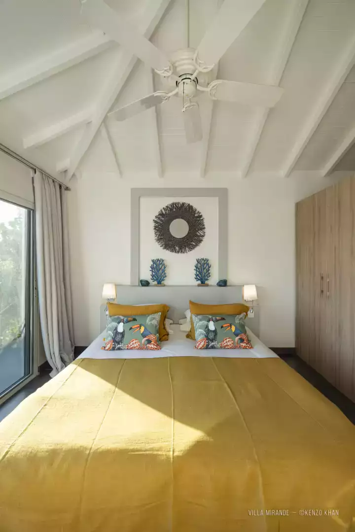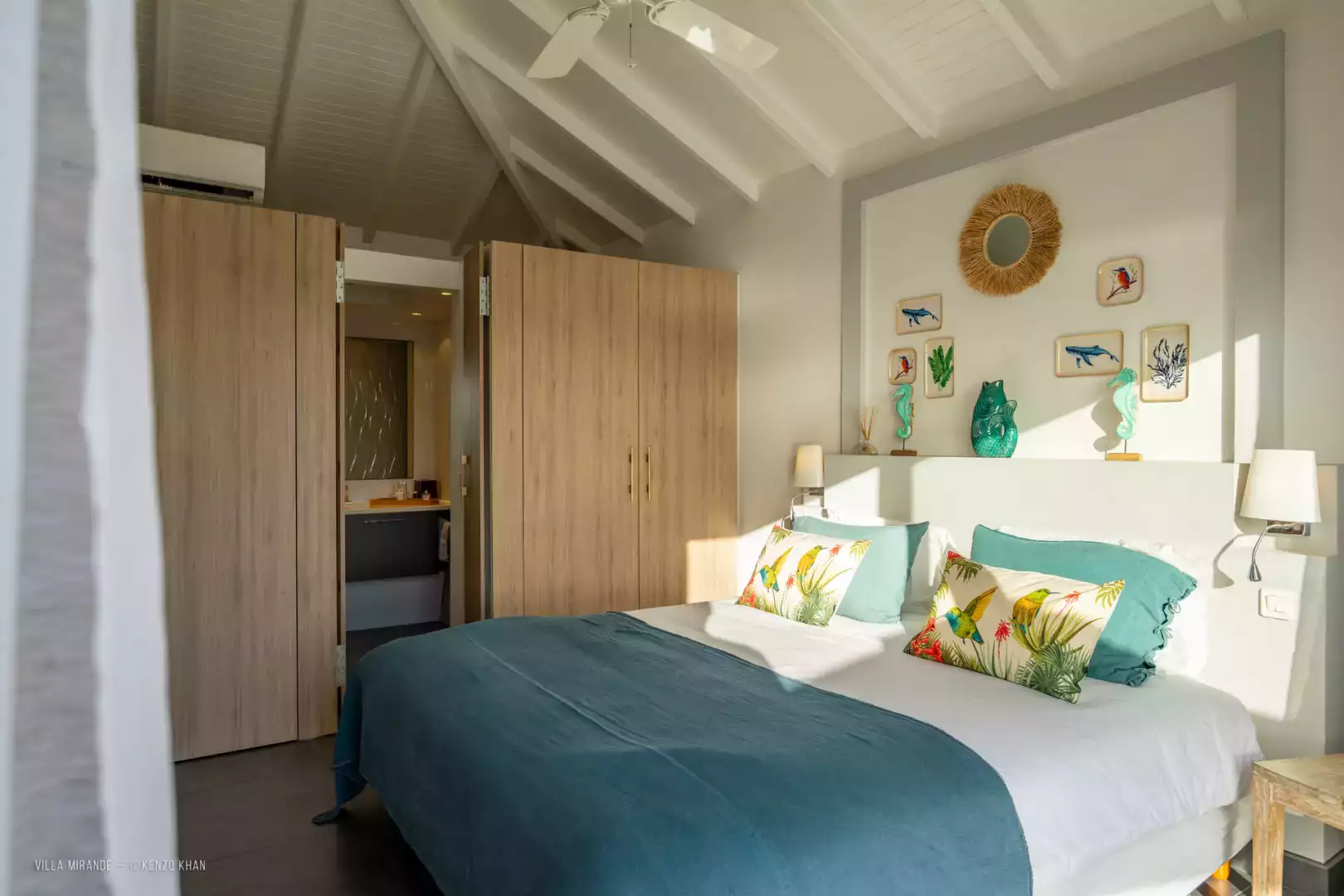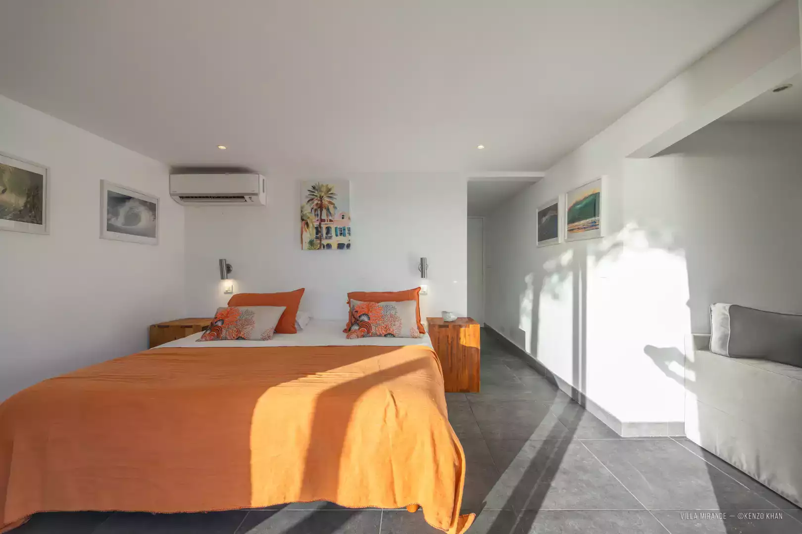 Au niveau supérieur, Lit King size (180 cm), climatisation (A/C), vue mer, salle de bain adjacente avec douche et toilettes, moustiquaires aux baies, sèche-cheveux, coffre-fort