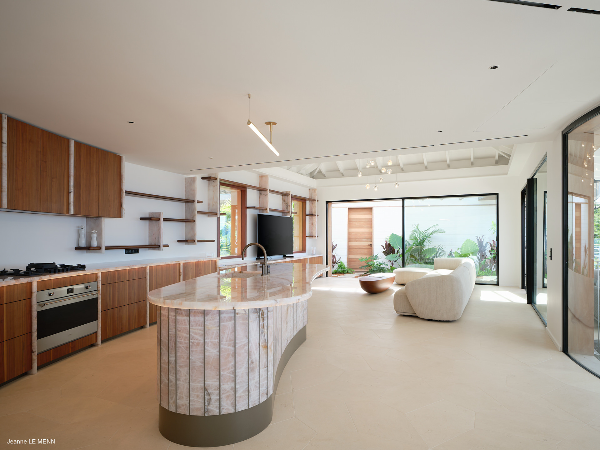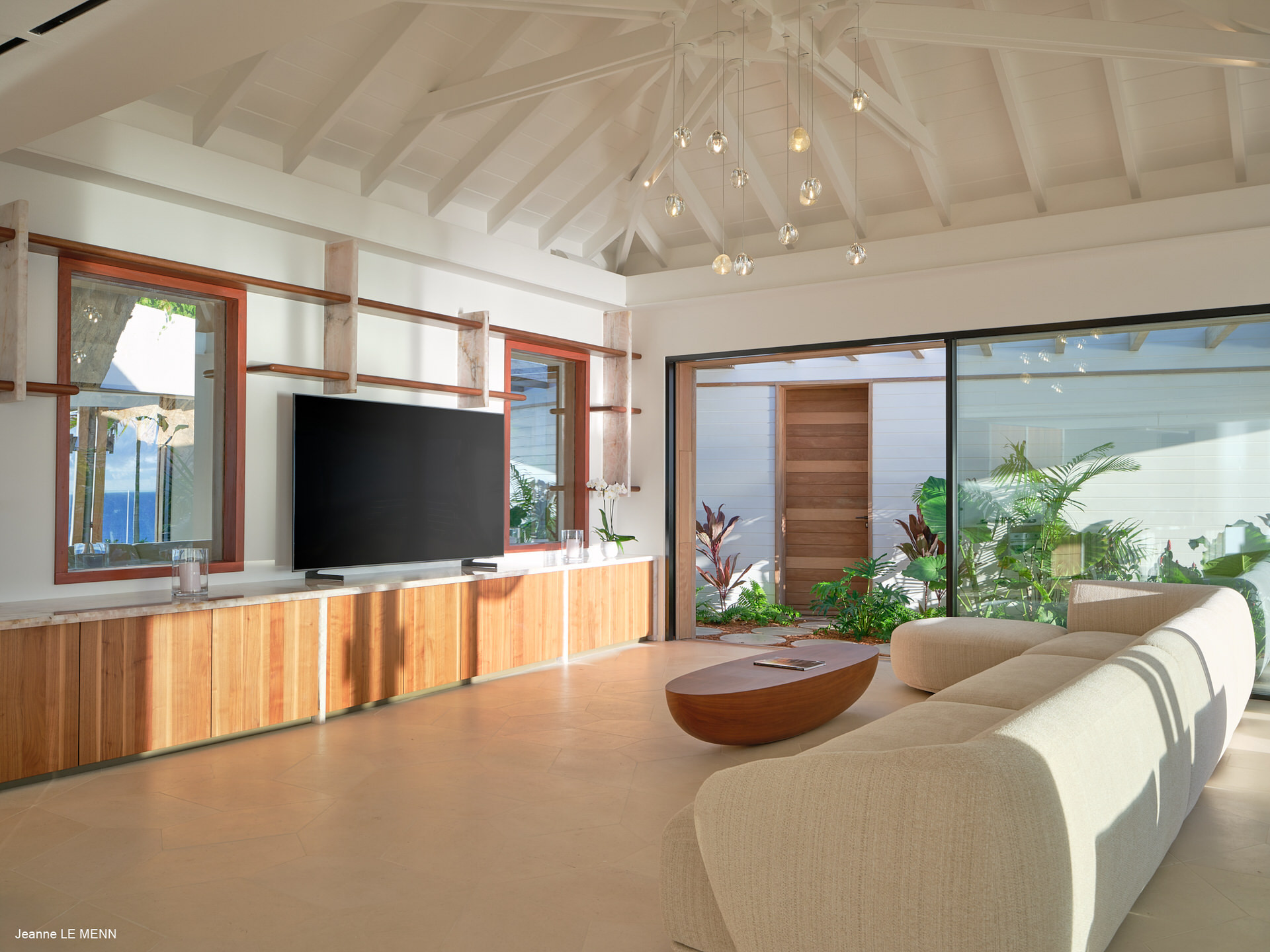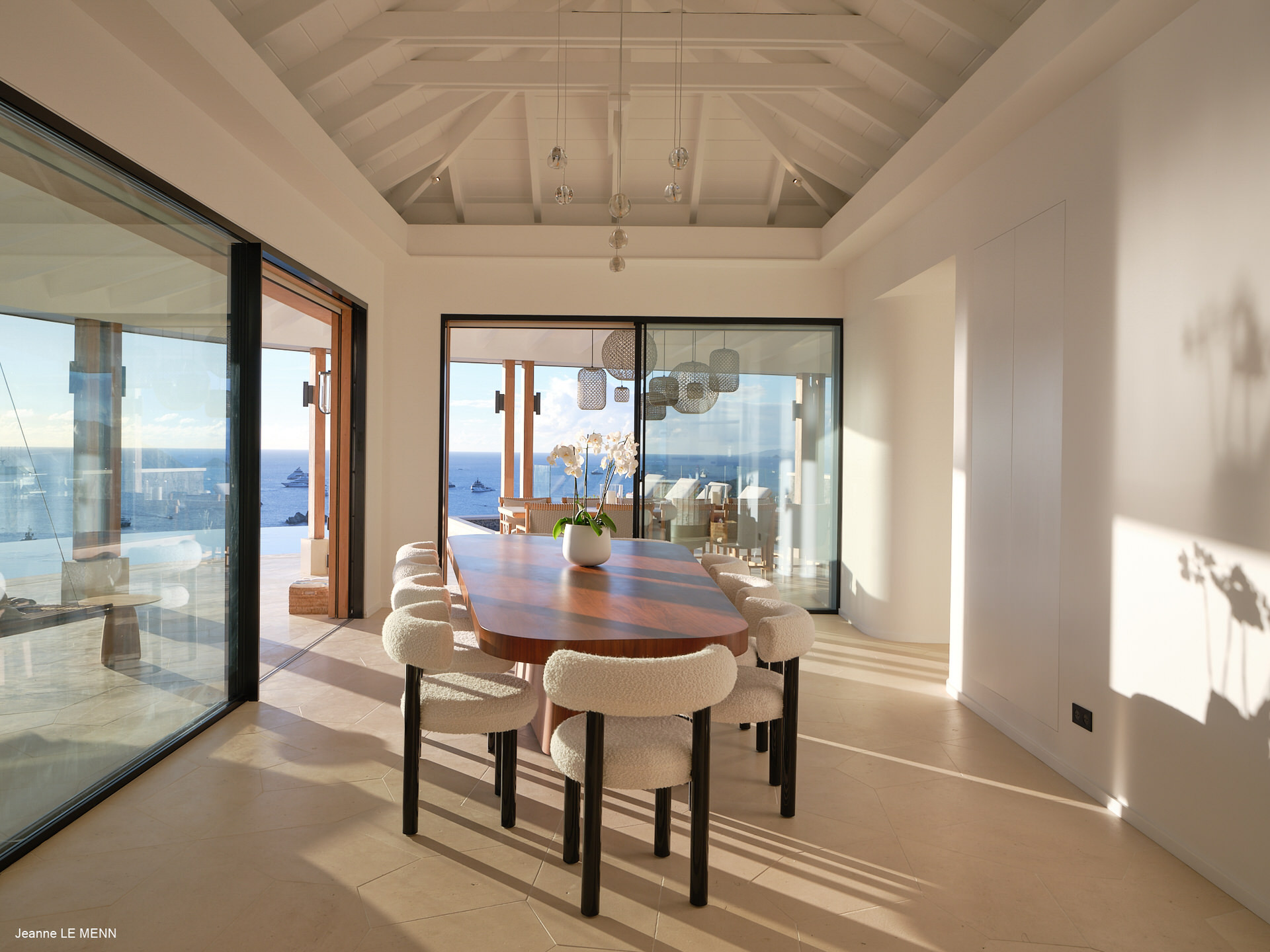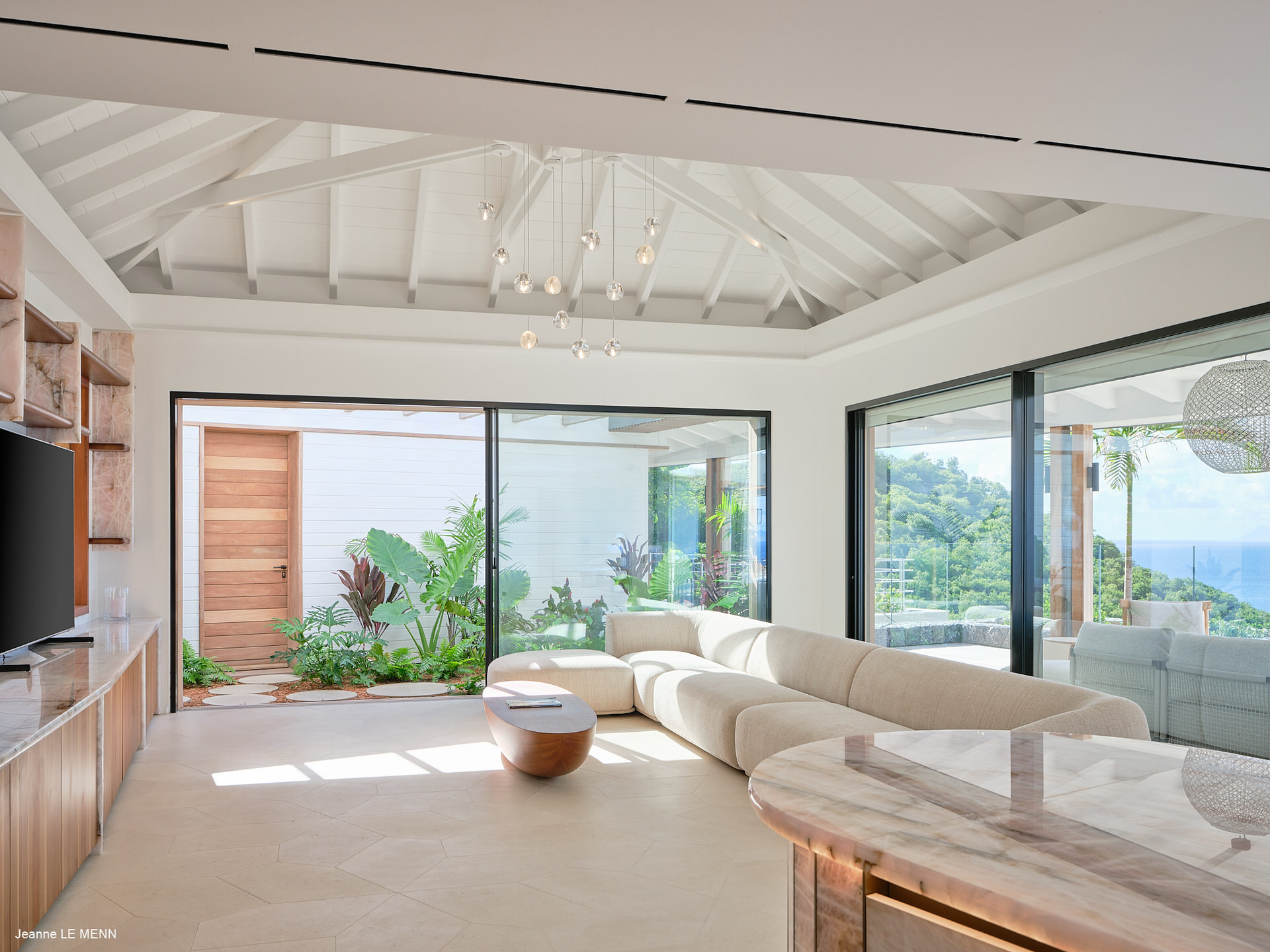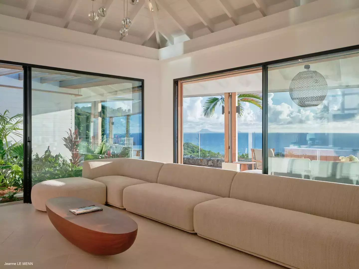 Les espaces de vie s’ouvrent largement sur l’extérieur, avec un salon climatisé prolongé par une cuisine ouverte entièrement équipée, idéale pour partager des moments conviviaux face à l’océan. La terrasse accueille une piscine chauffée, un jacuzzi ainsi que plusieurs espaces de détente aménagés pour profiter pleinement du climat des Caraïbes.