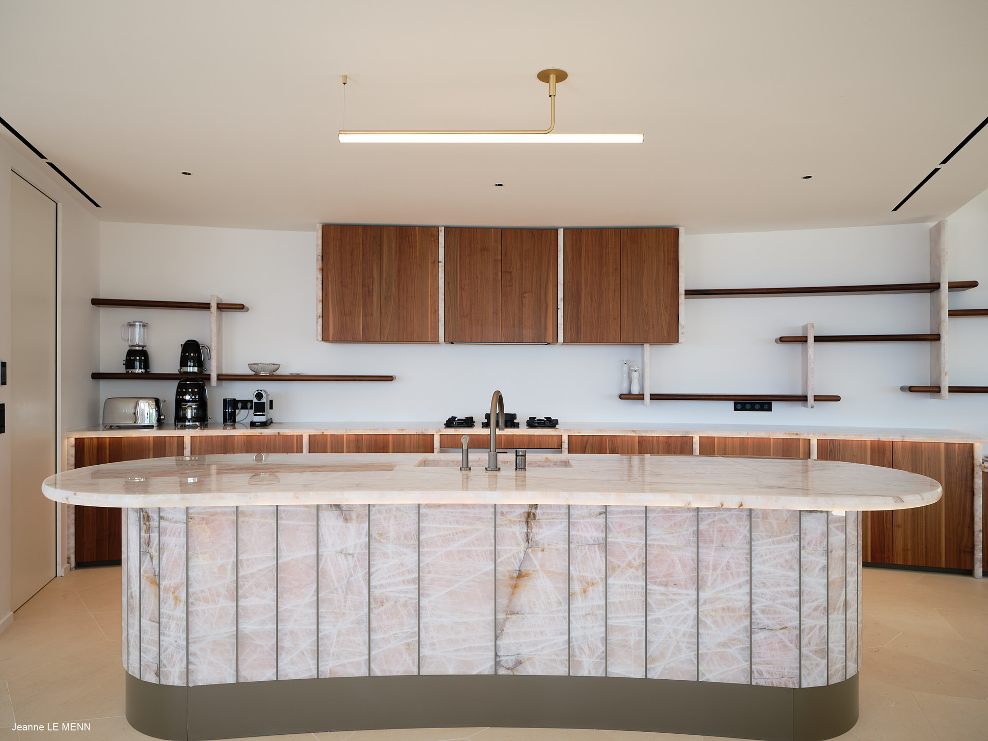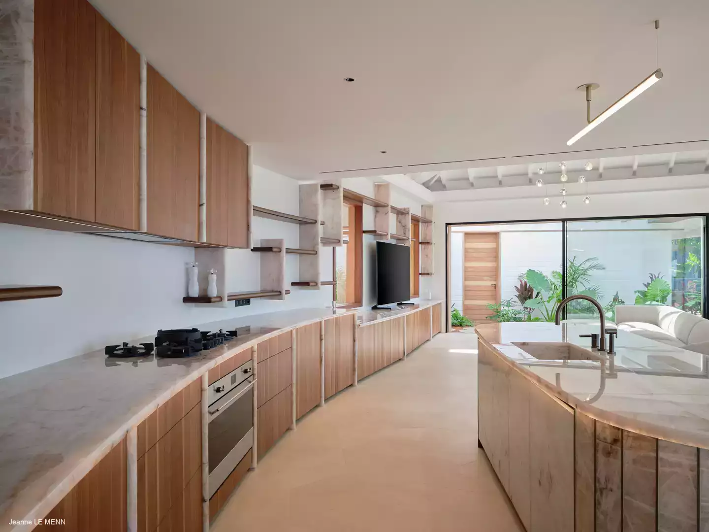 Ouverte sur le salon, réfrigérateur, congélateur, lave-vaisselle, four, four micro-ondes, bouilloire, cave à vin, mixeur, grille-pain, cafetière Nespresso, cafetière filtre, presse-agrumes