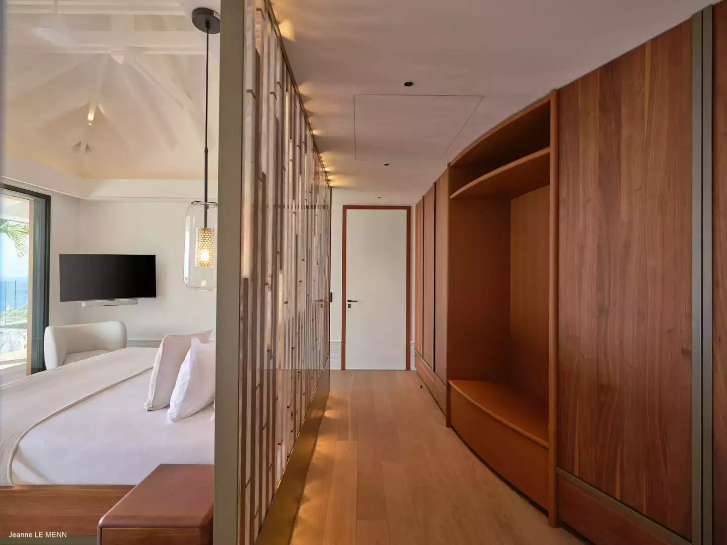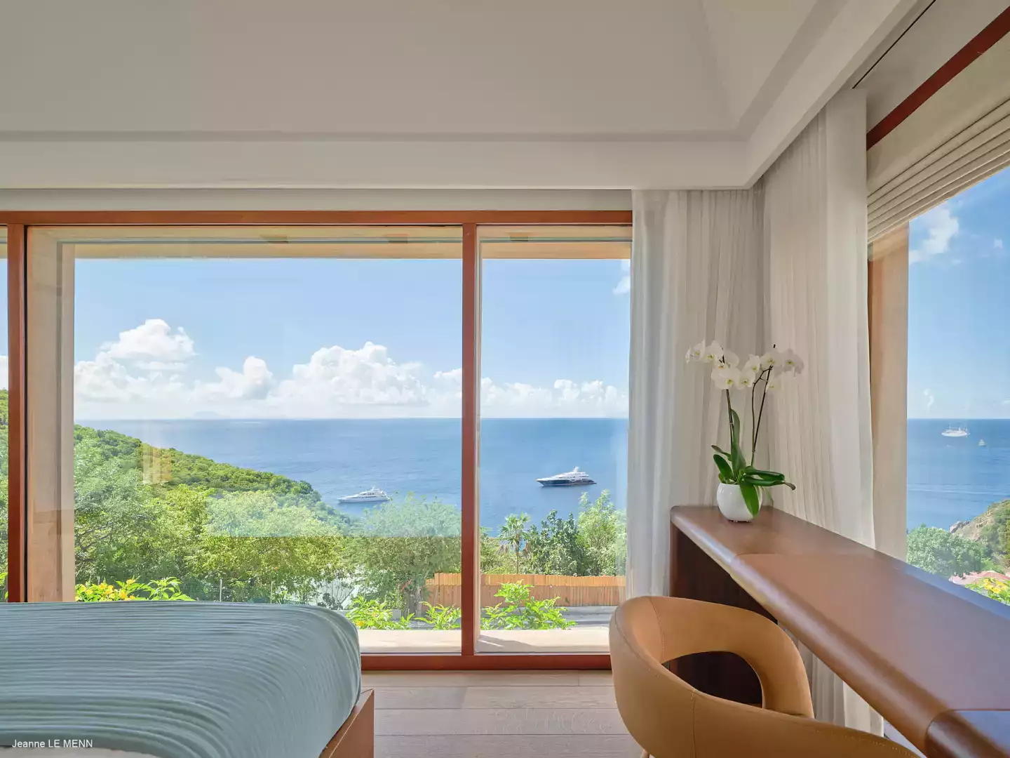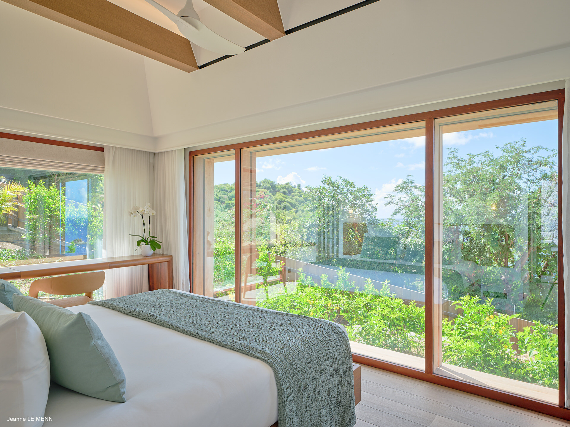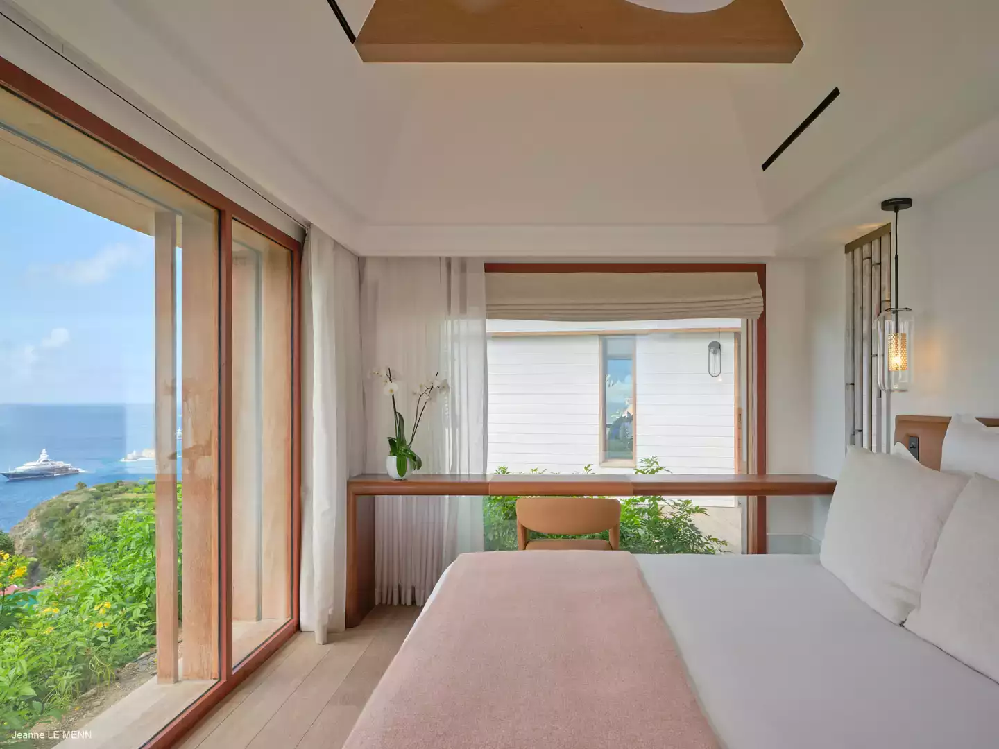 La villa dispose de quatre chambres, toutes avec vue mer, réparties dans des bungalows indépendants pour garantir intimité et confort. Trois chambres se situent en niveau inférieur, chacune avec salle de bain attenante, tandis que la suite principale, au niveau de la piscine, offre un bel espace avec des prestations haut de gamme.