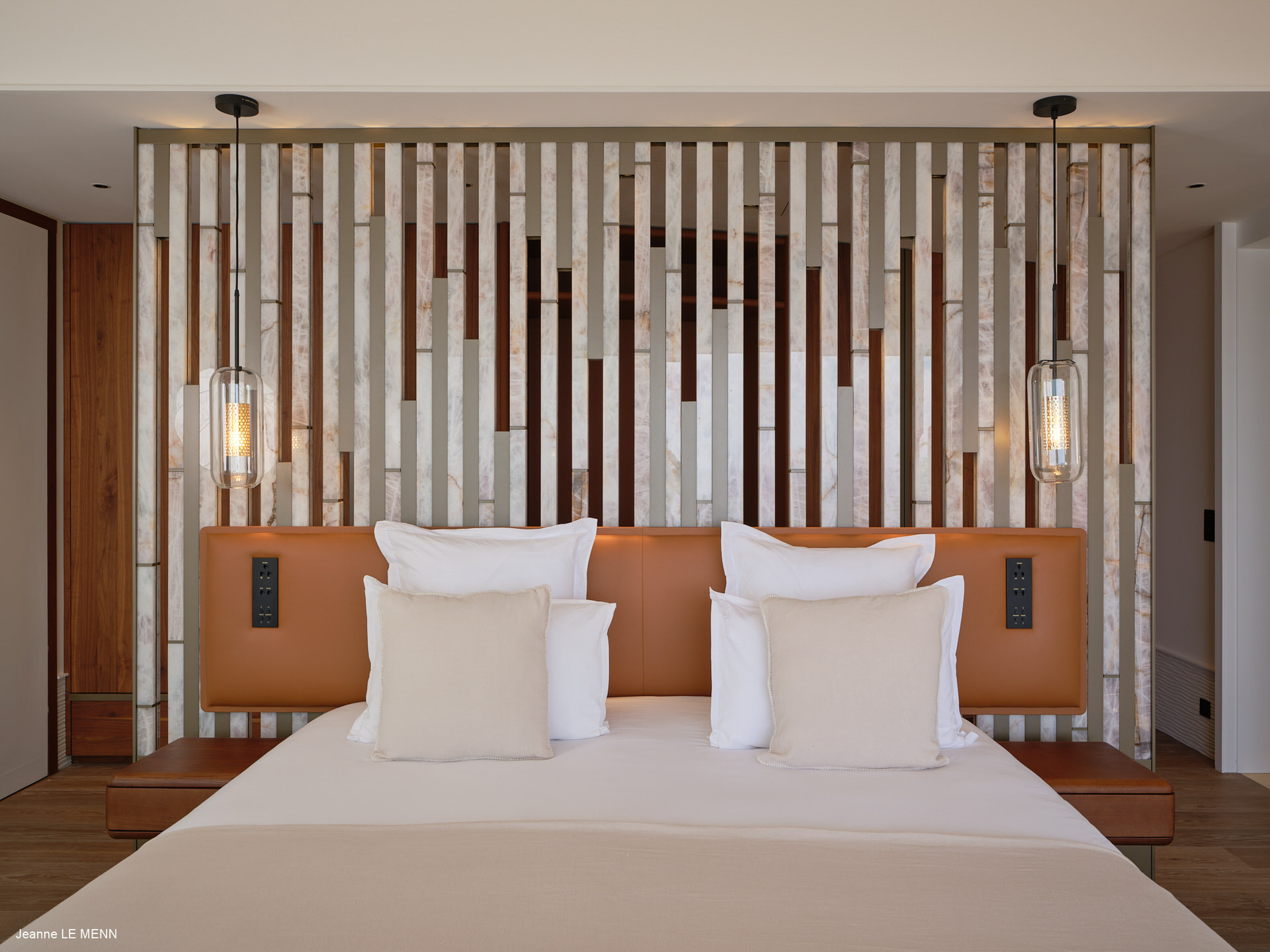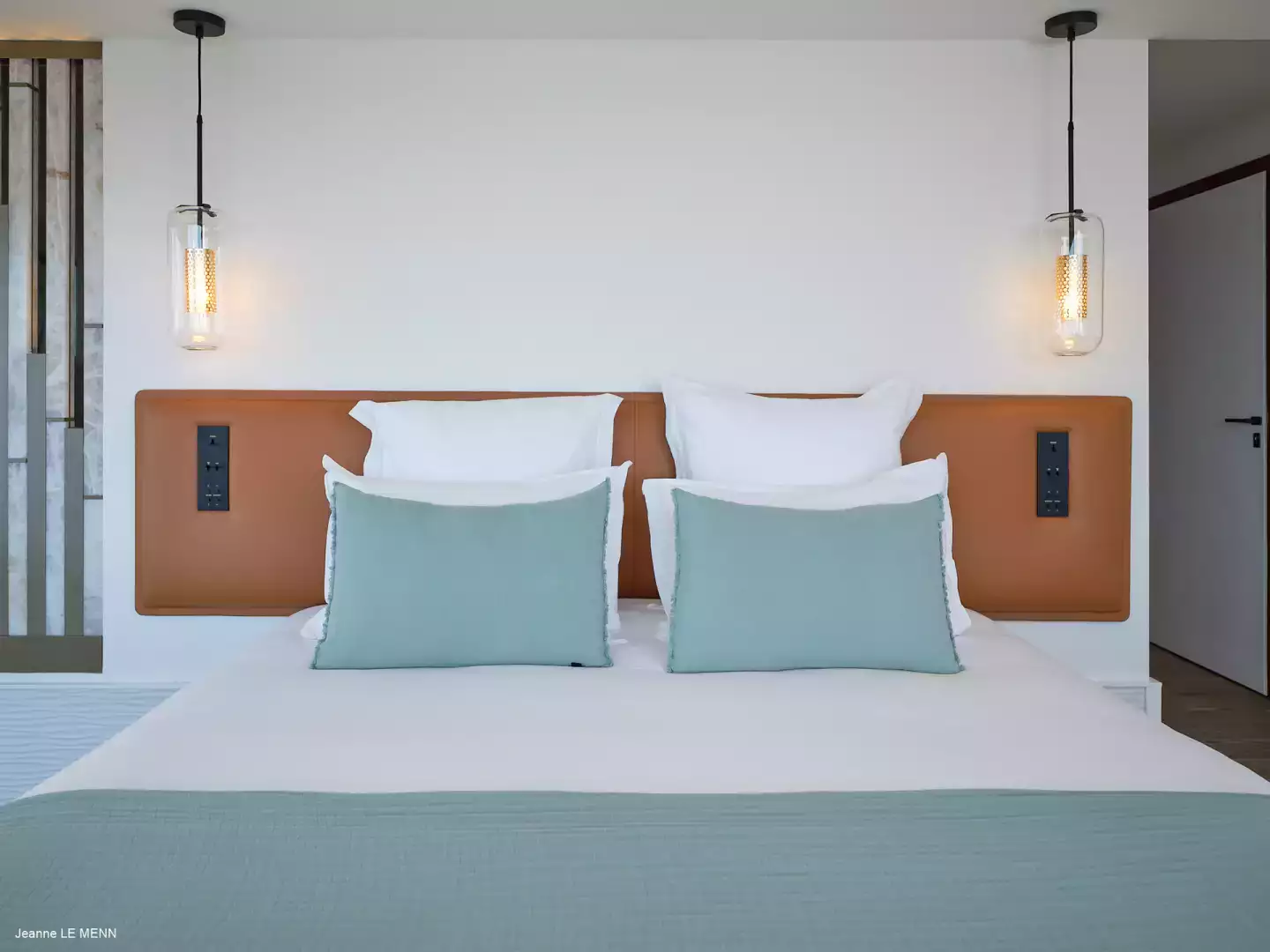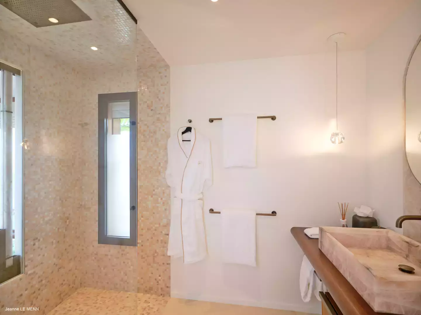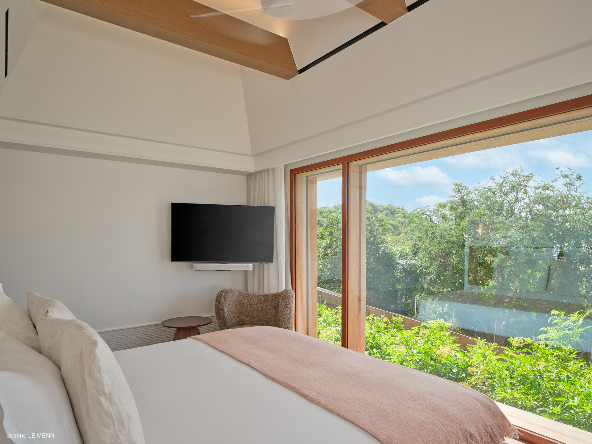 La villa dispose de quatre chambres, toutes avec vue mer, réparties dans des bungalows indépendants pour garantir intimité et confort. Trois chambres se situent en niveau inférieur, chacune avec salle de bain attenante, tandis que la suite principale, au niveau de la piscine, offre un bel espace avec des prestations haut de gamme.